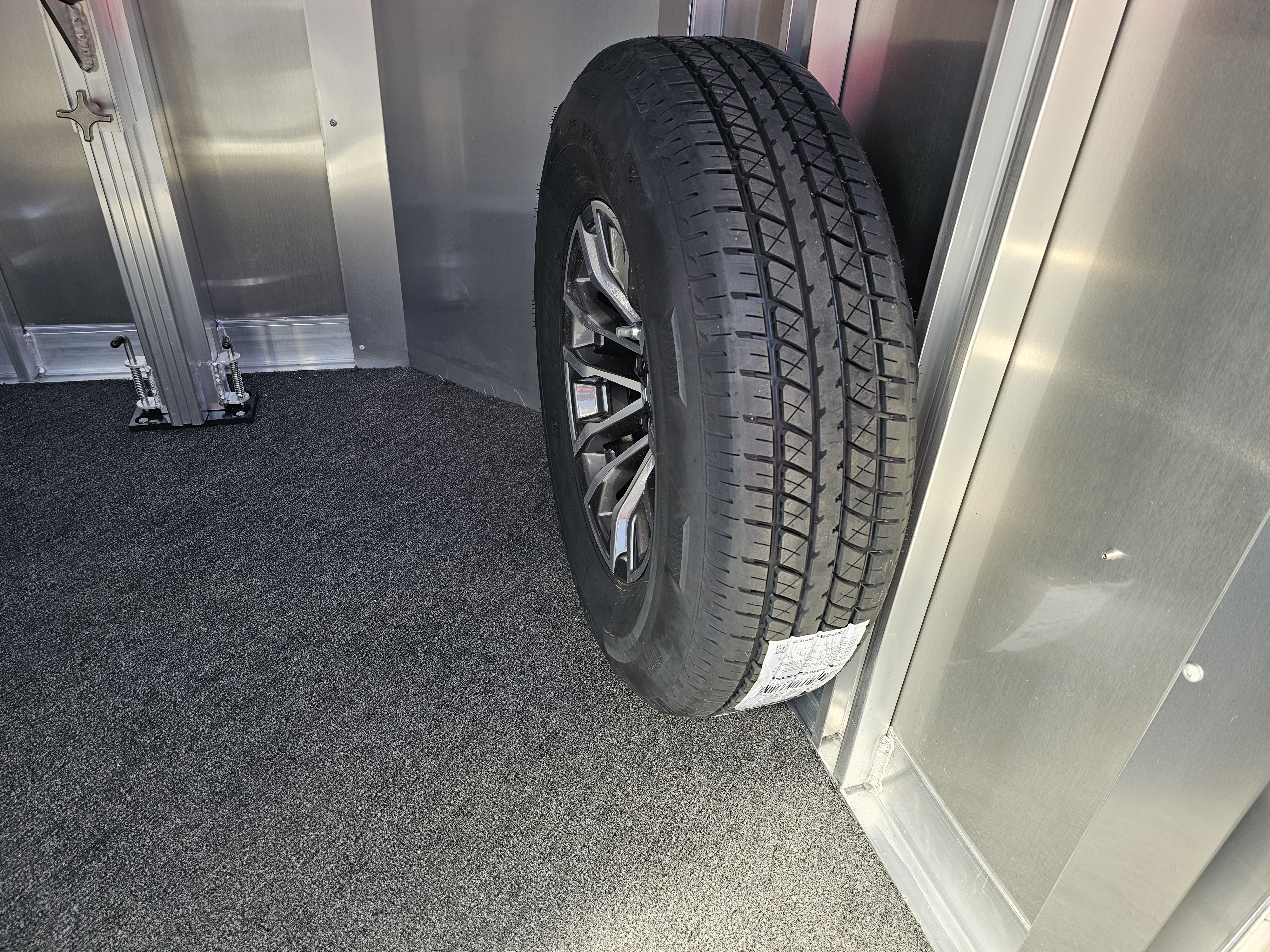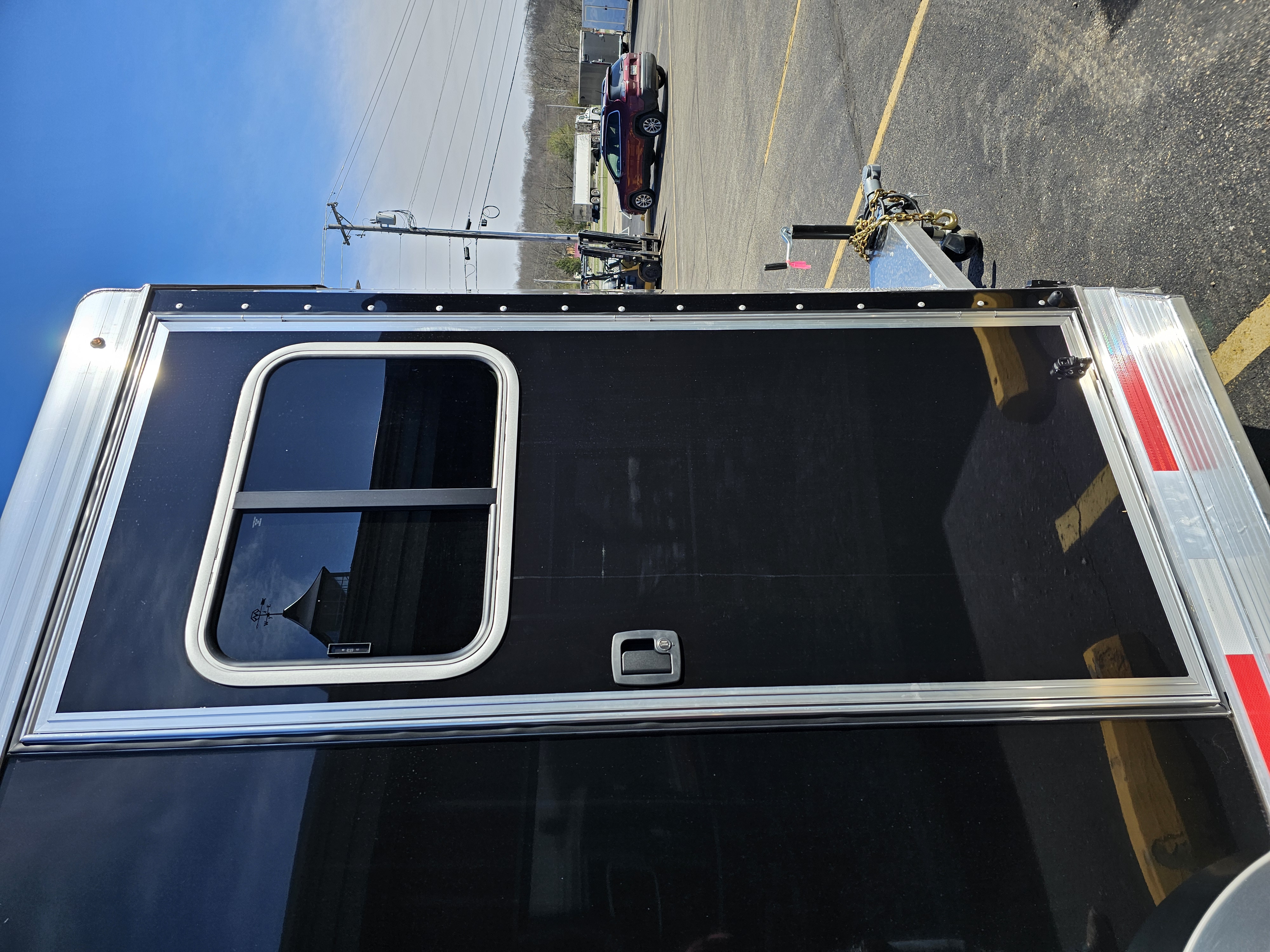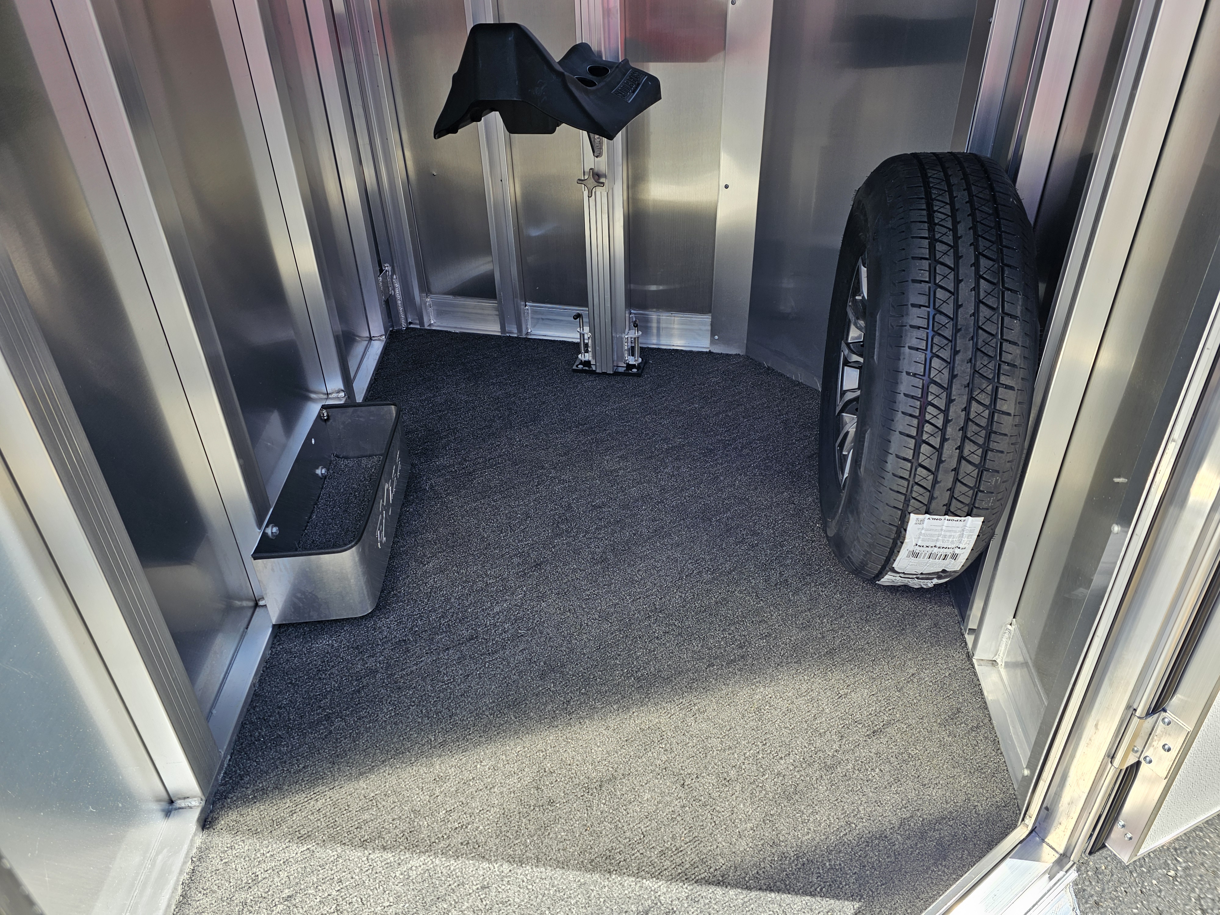 Camper door with sliding window in dressing room; Carpeted floor in dressing room; Full-width nylon strap at rear of trailer