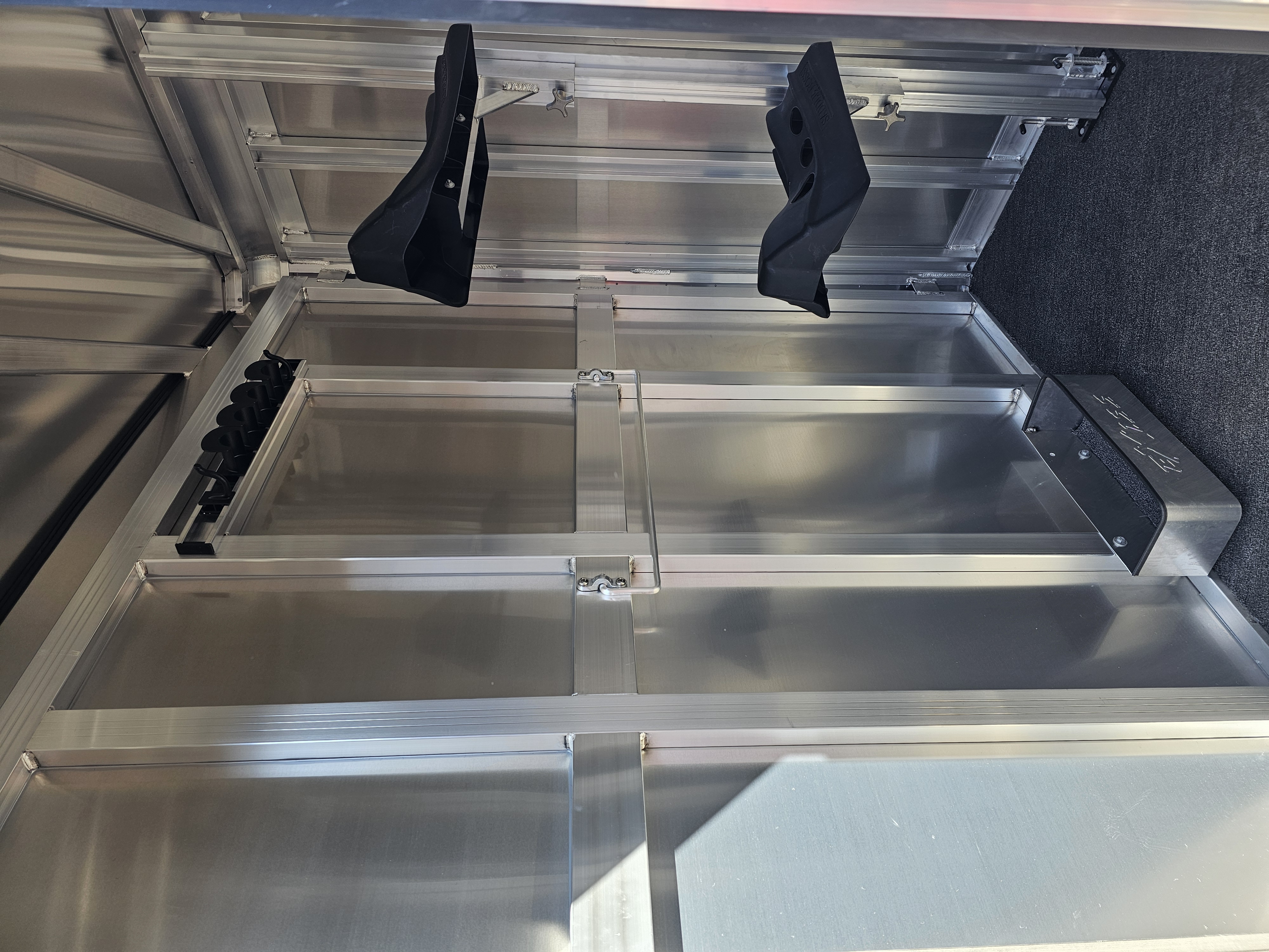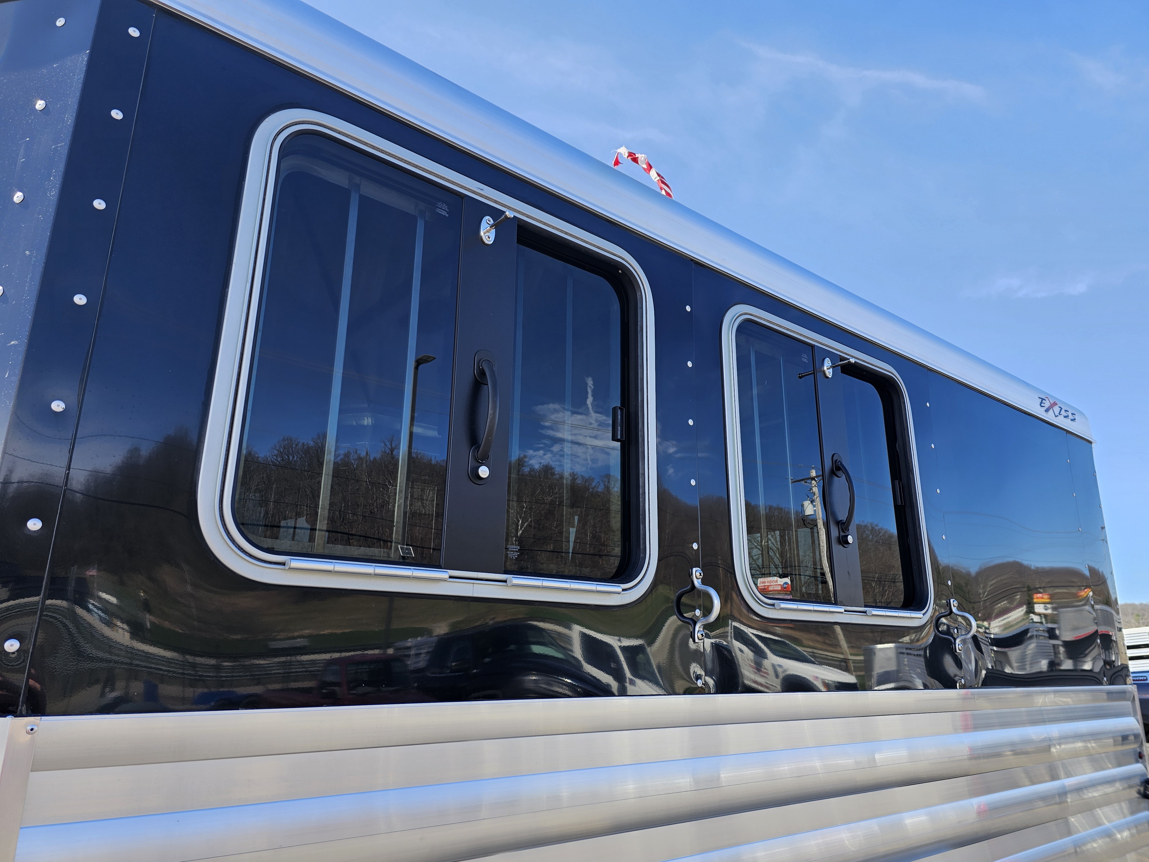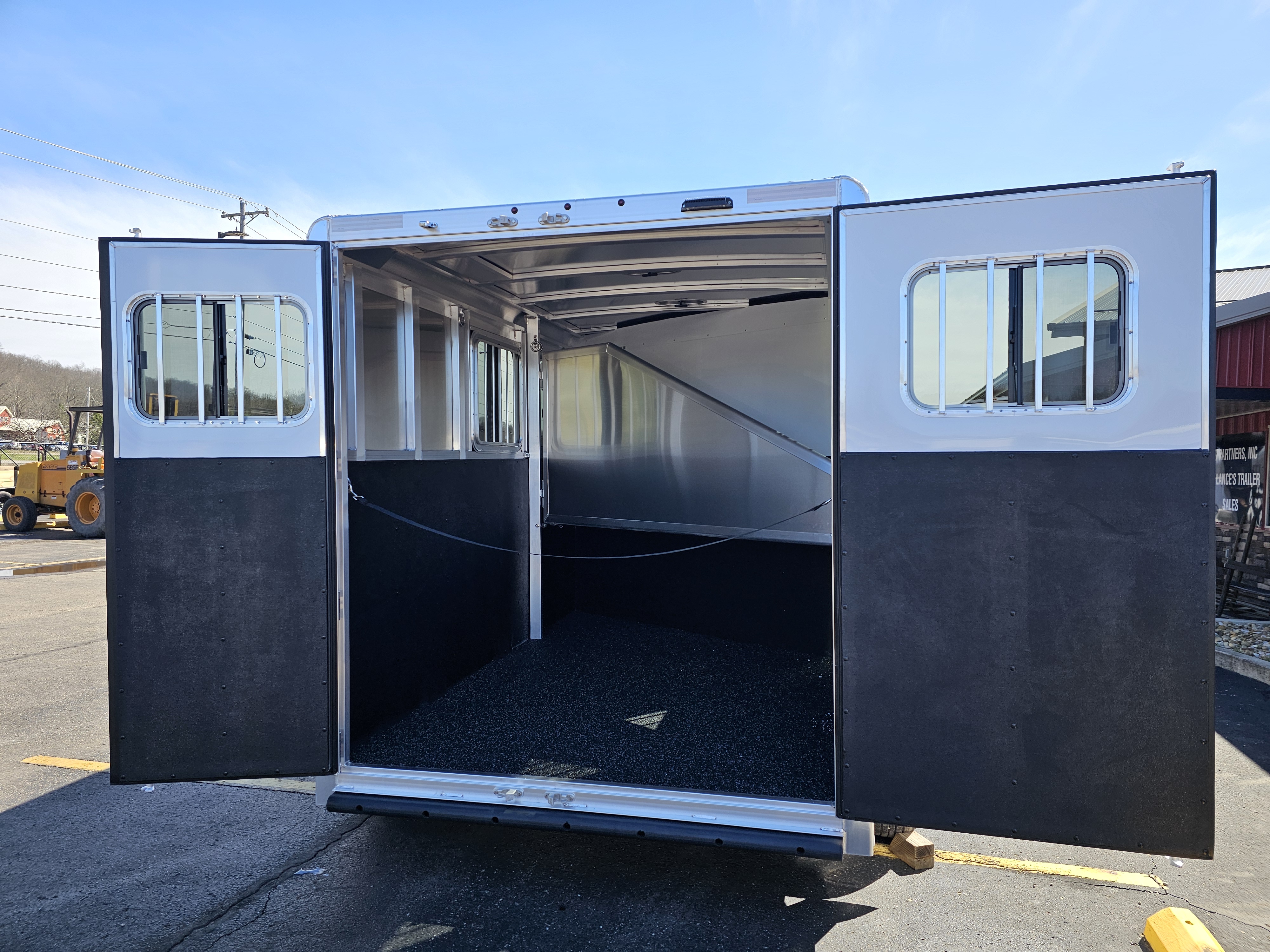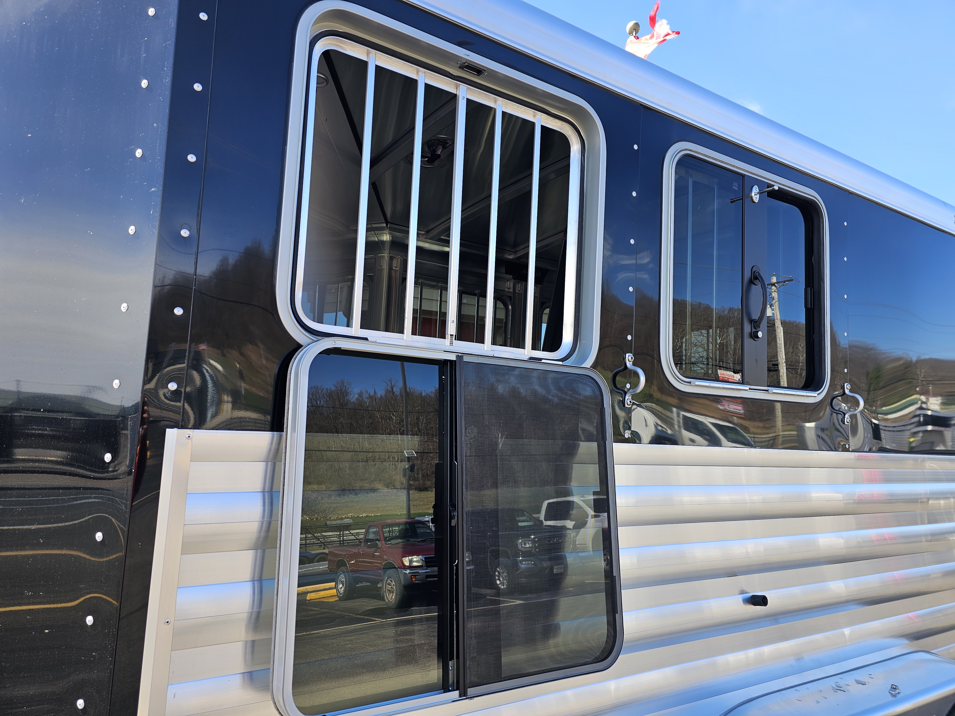 Camper door with sliding window in dressing room; Carpeted floor in dressing room; Full-width nylon strap at rear of trailer