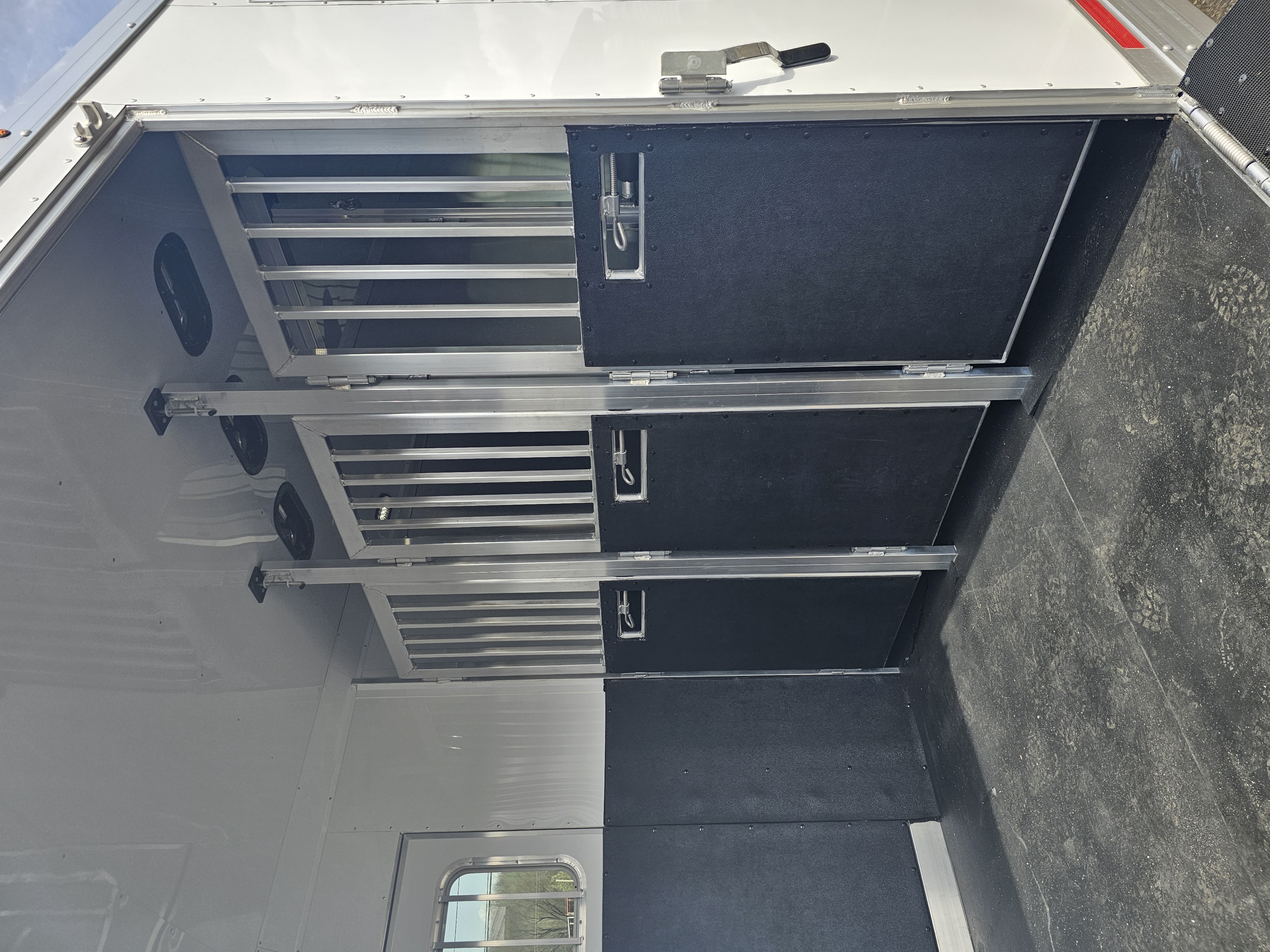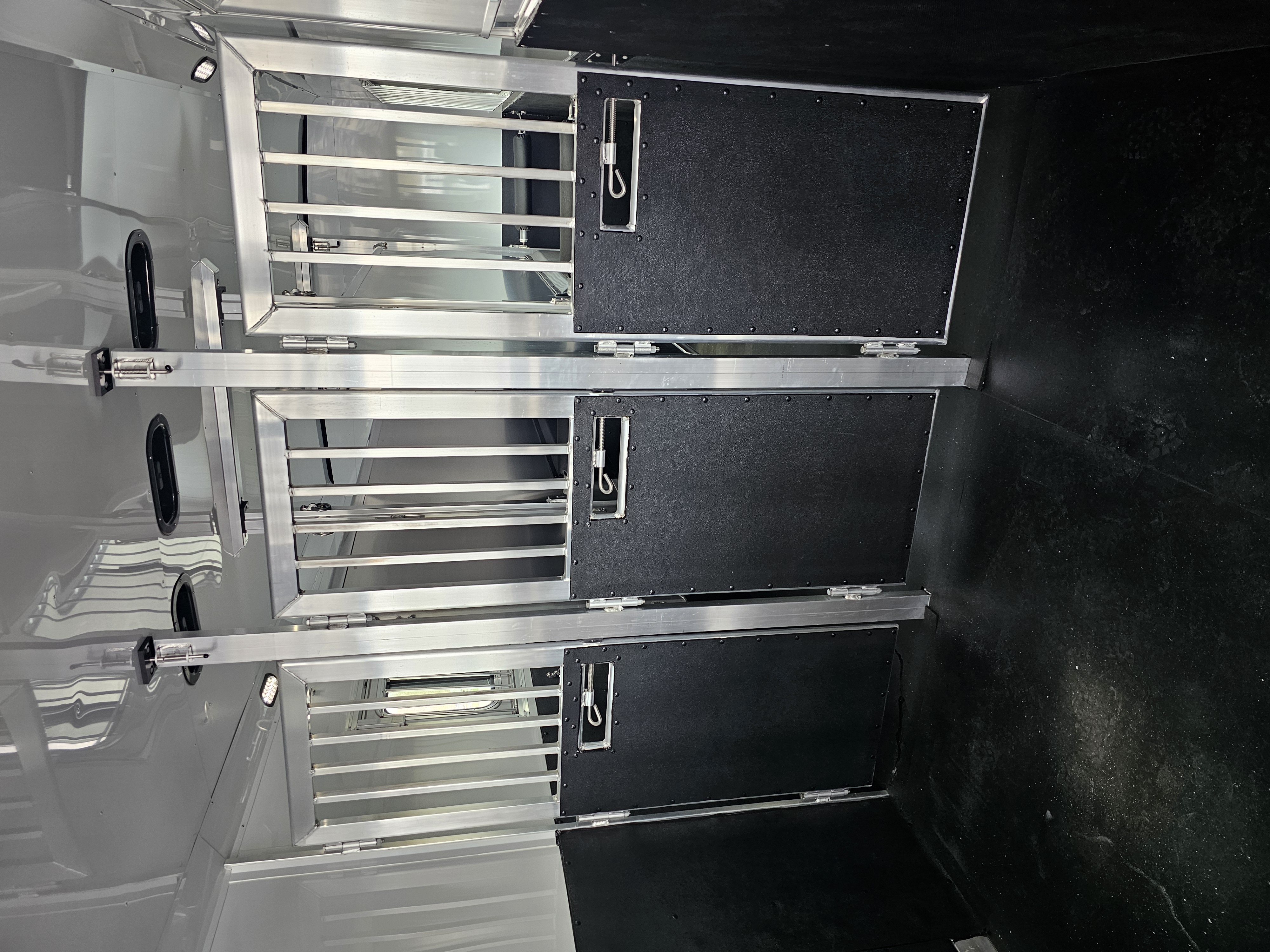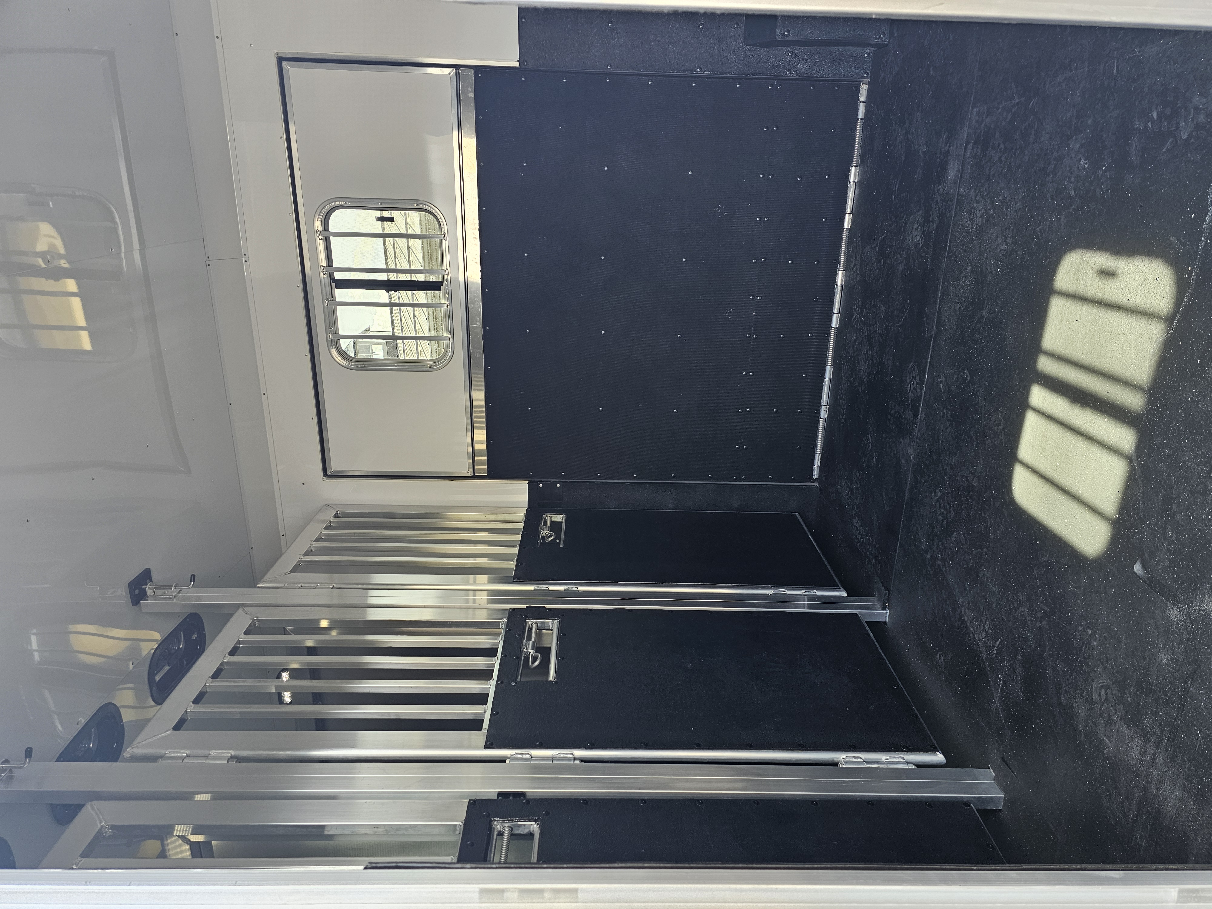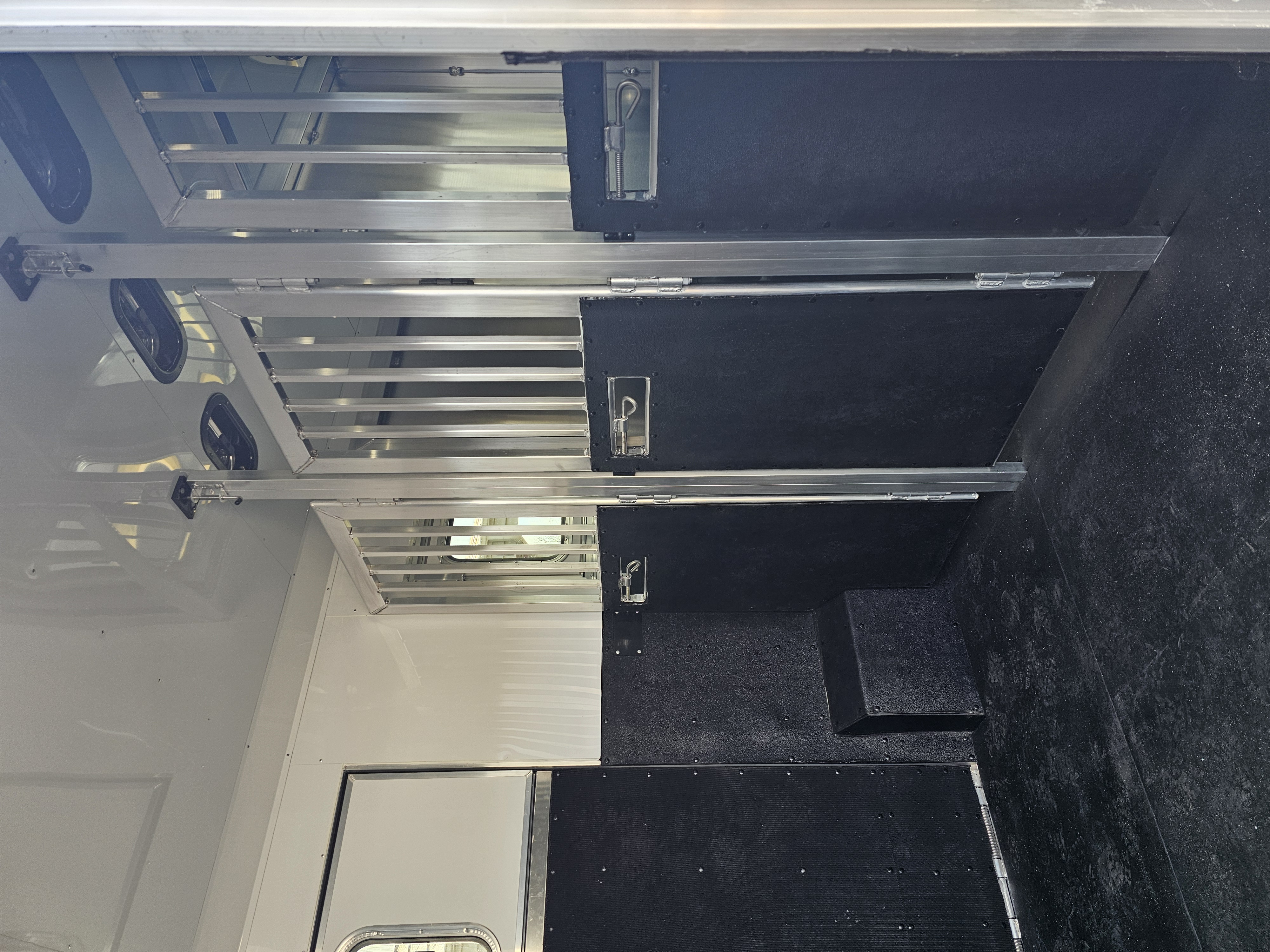 Horse area walls insulated and lined w/ white aluminum; Rubber installed 48″ high w/ white aluminum lining above; Aluminum kickplate behind rubber lining