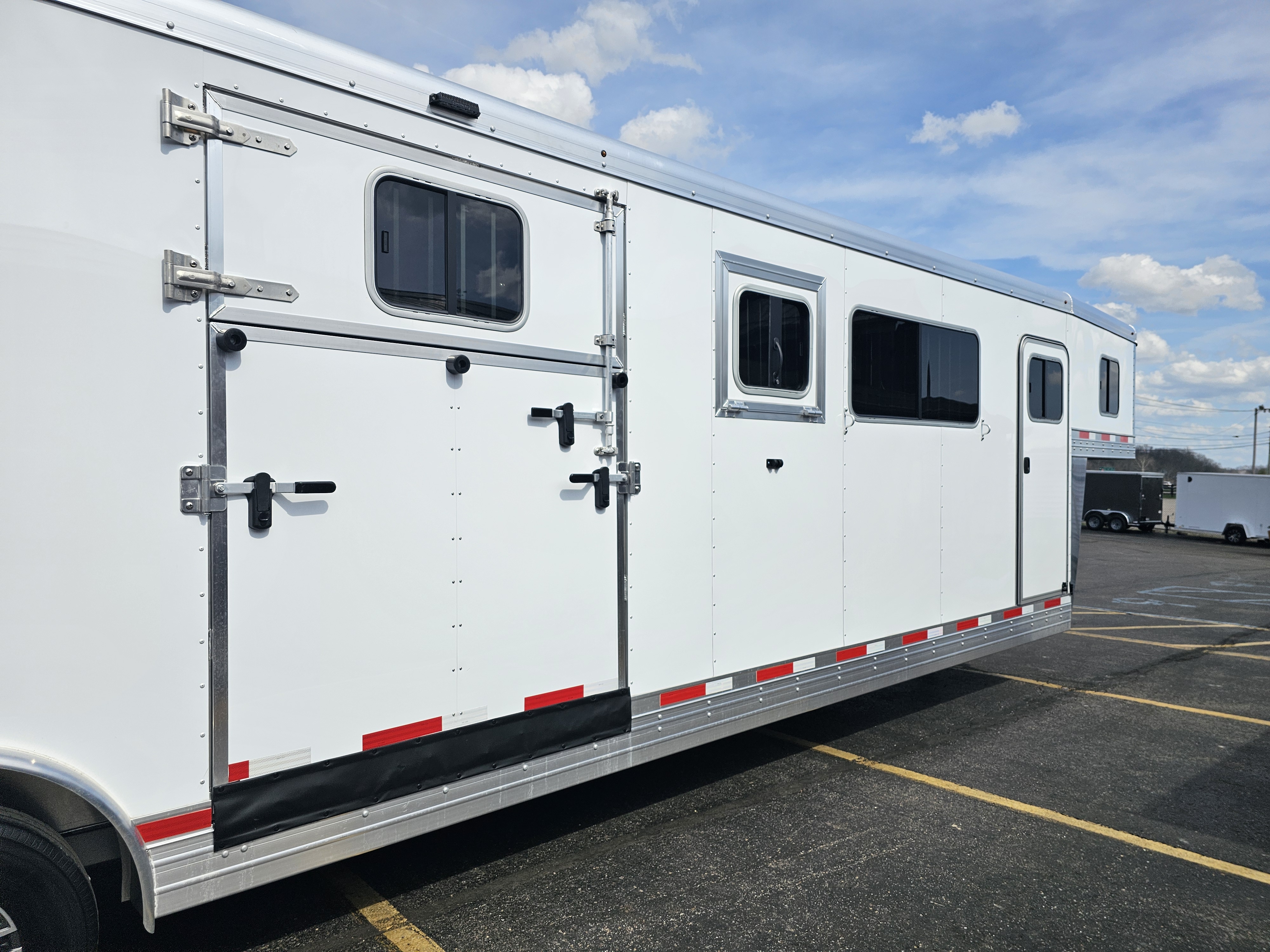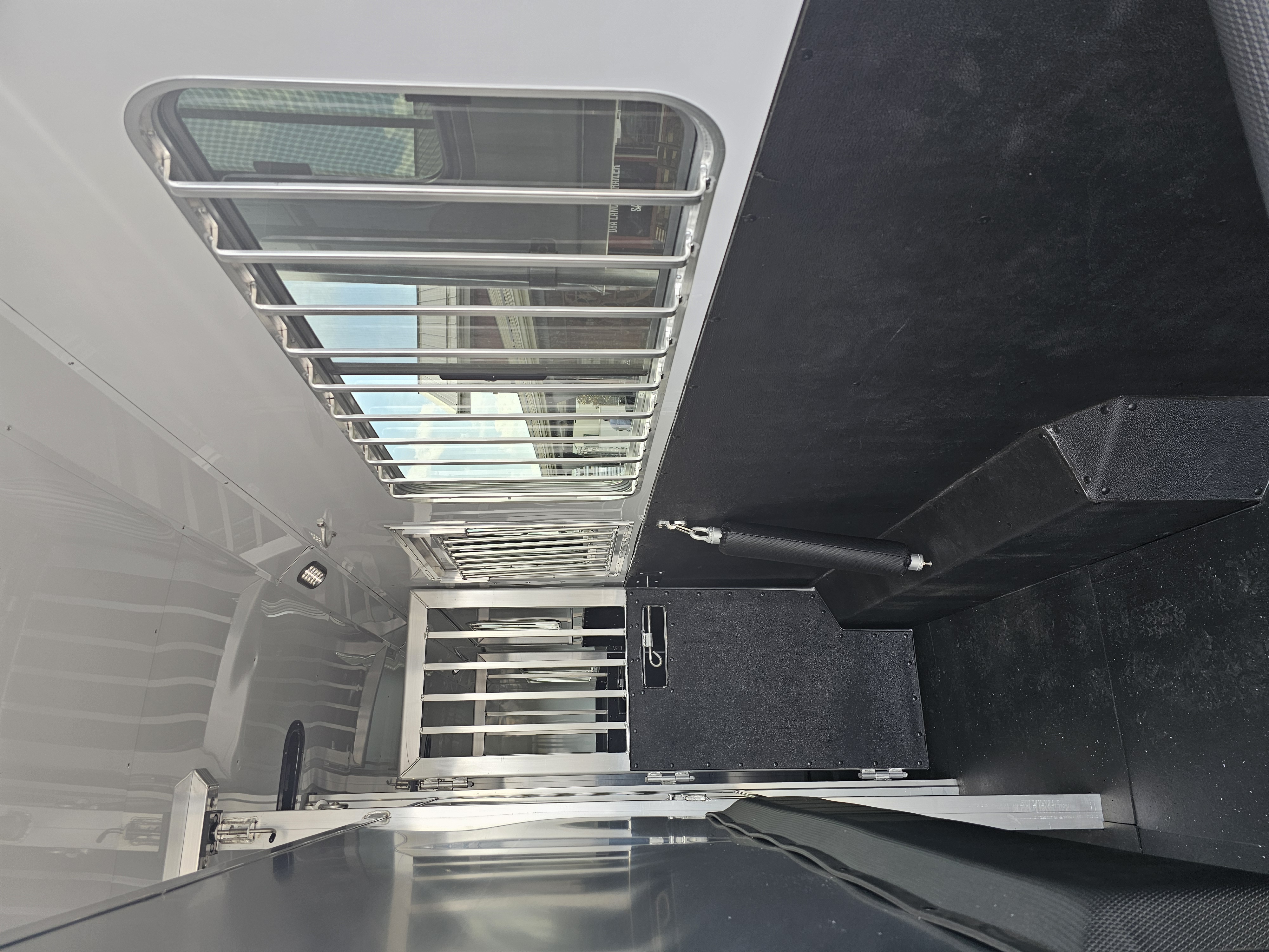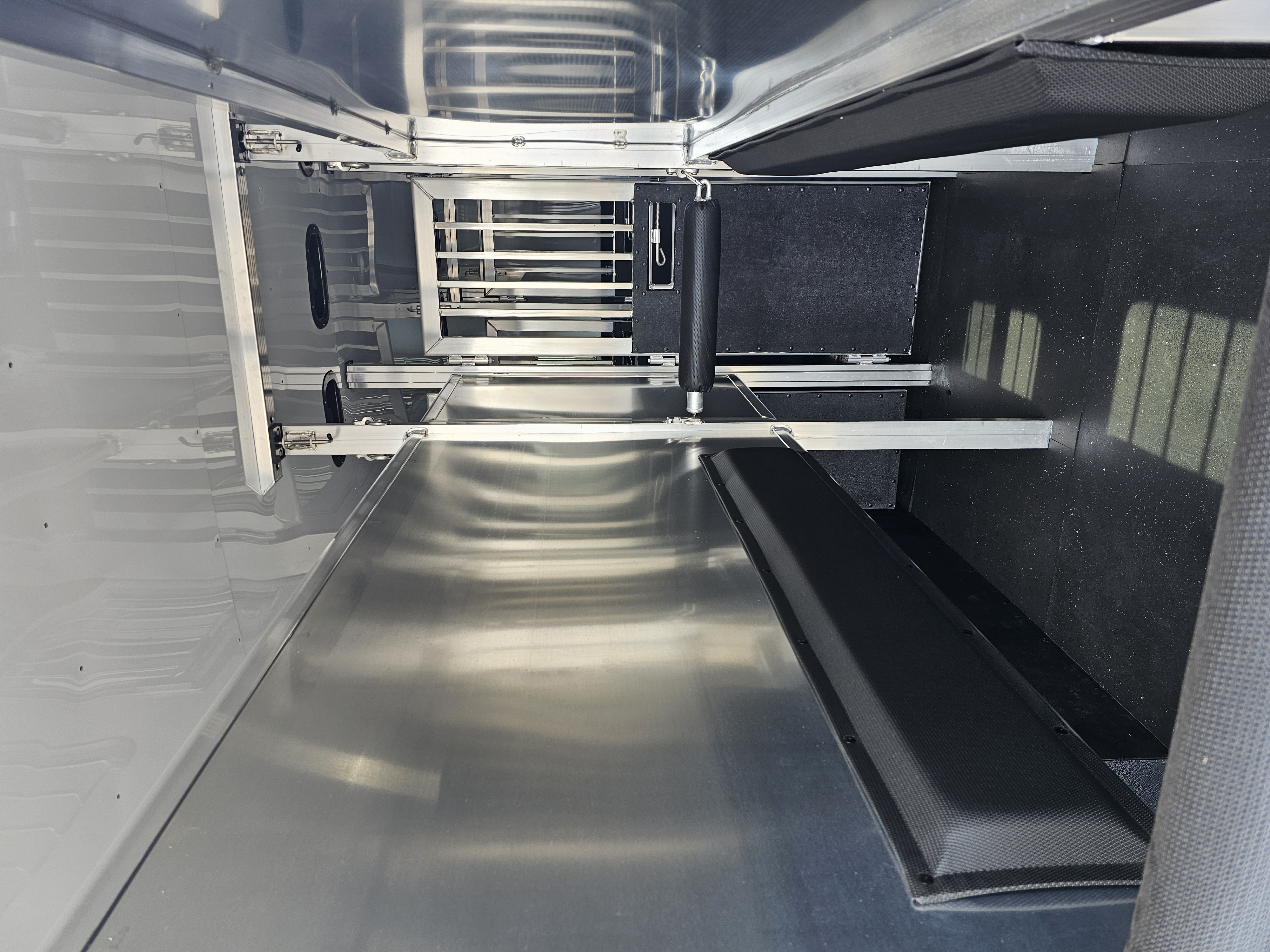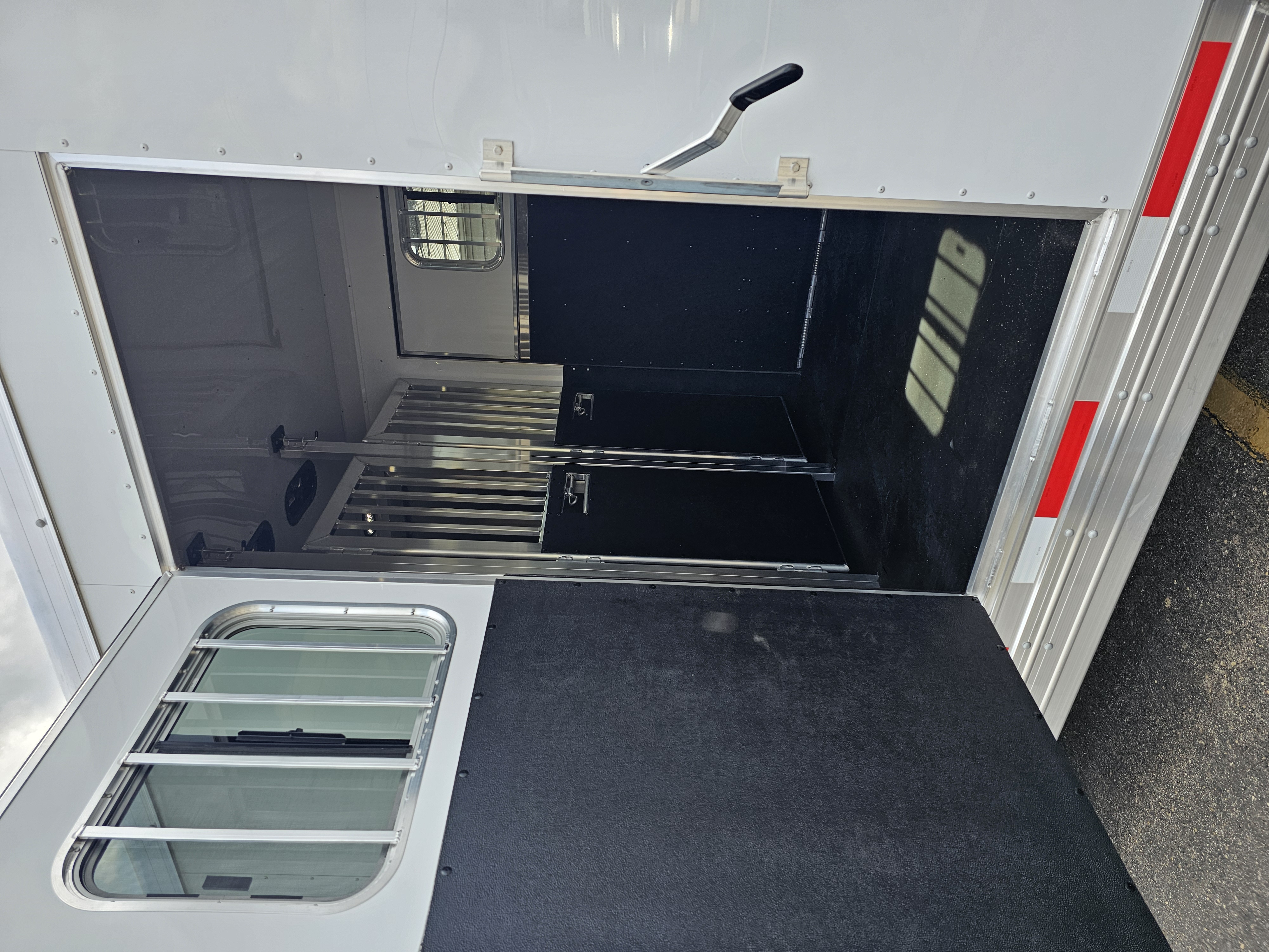 Horse area walls insulated and lined w/ white aluminum; Rubber installed 48″ high w/ white aluminum lining above; Aluminum kickplate behind rubber lining
