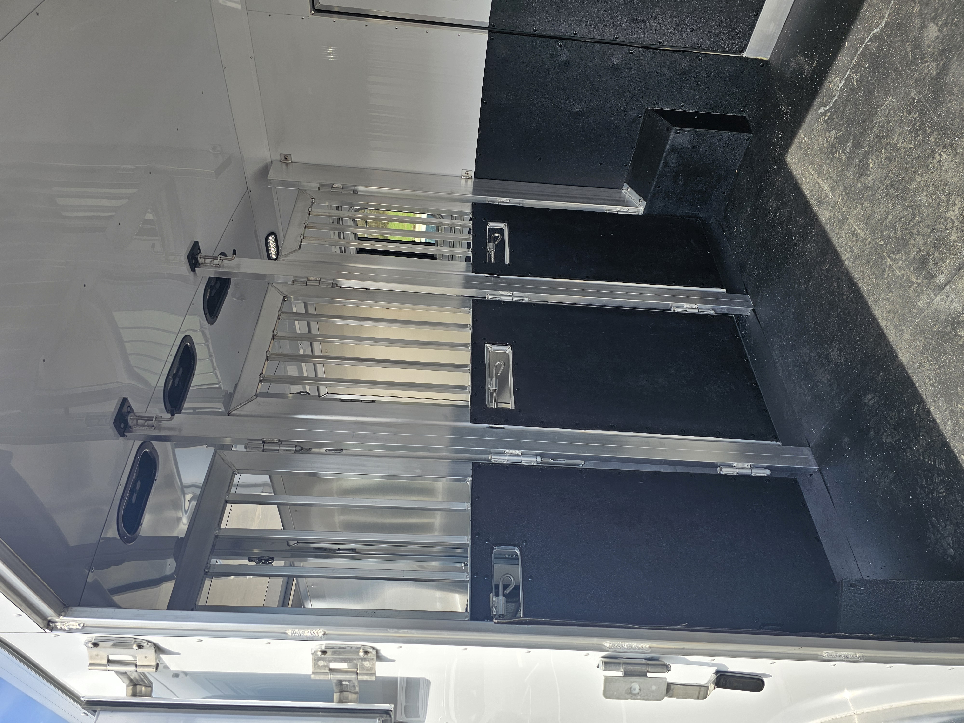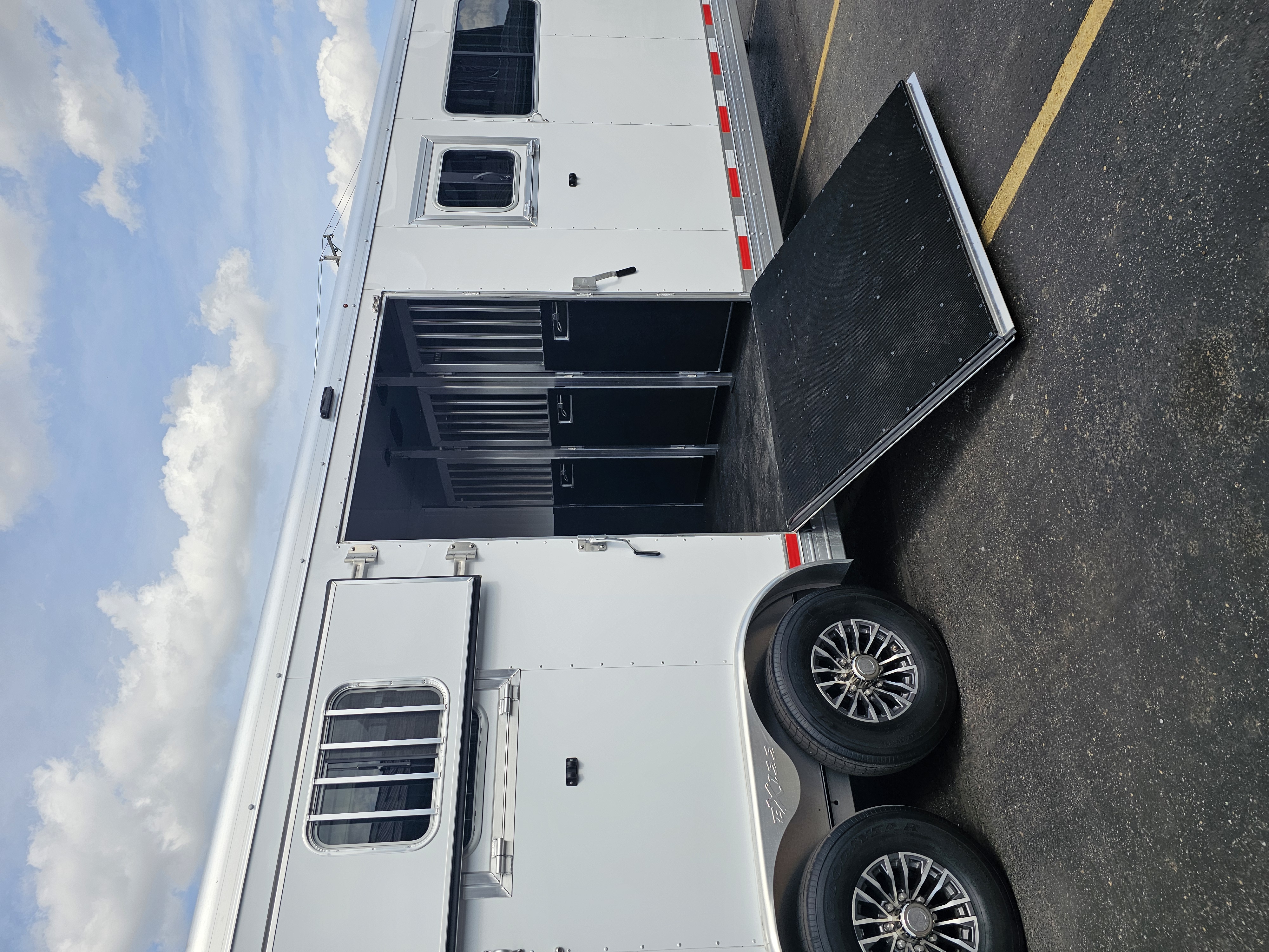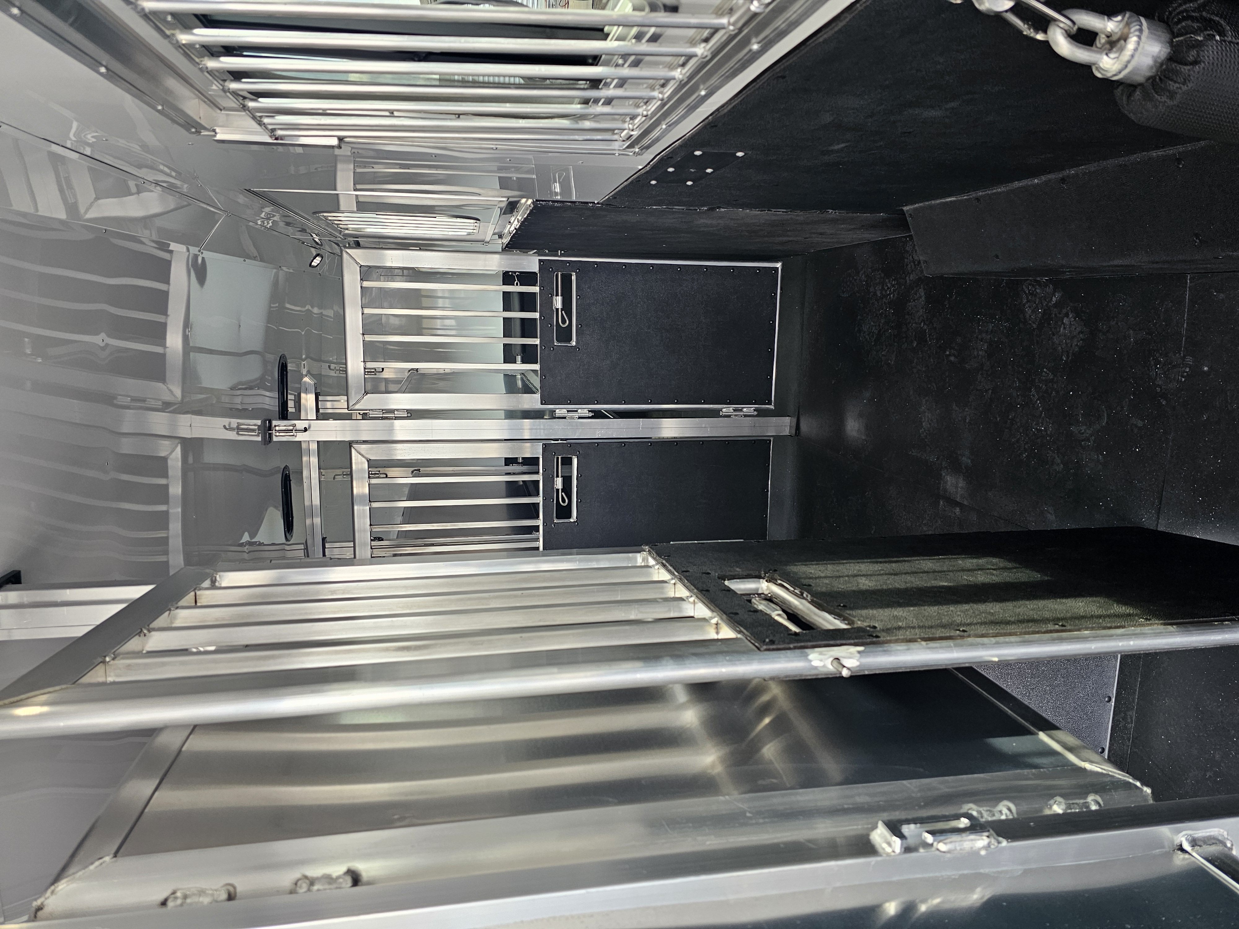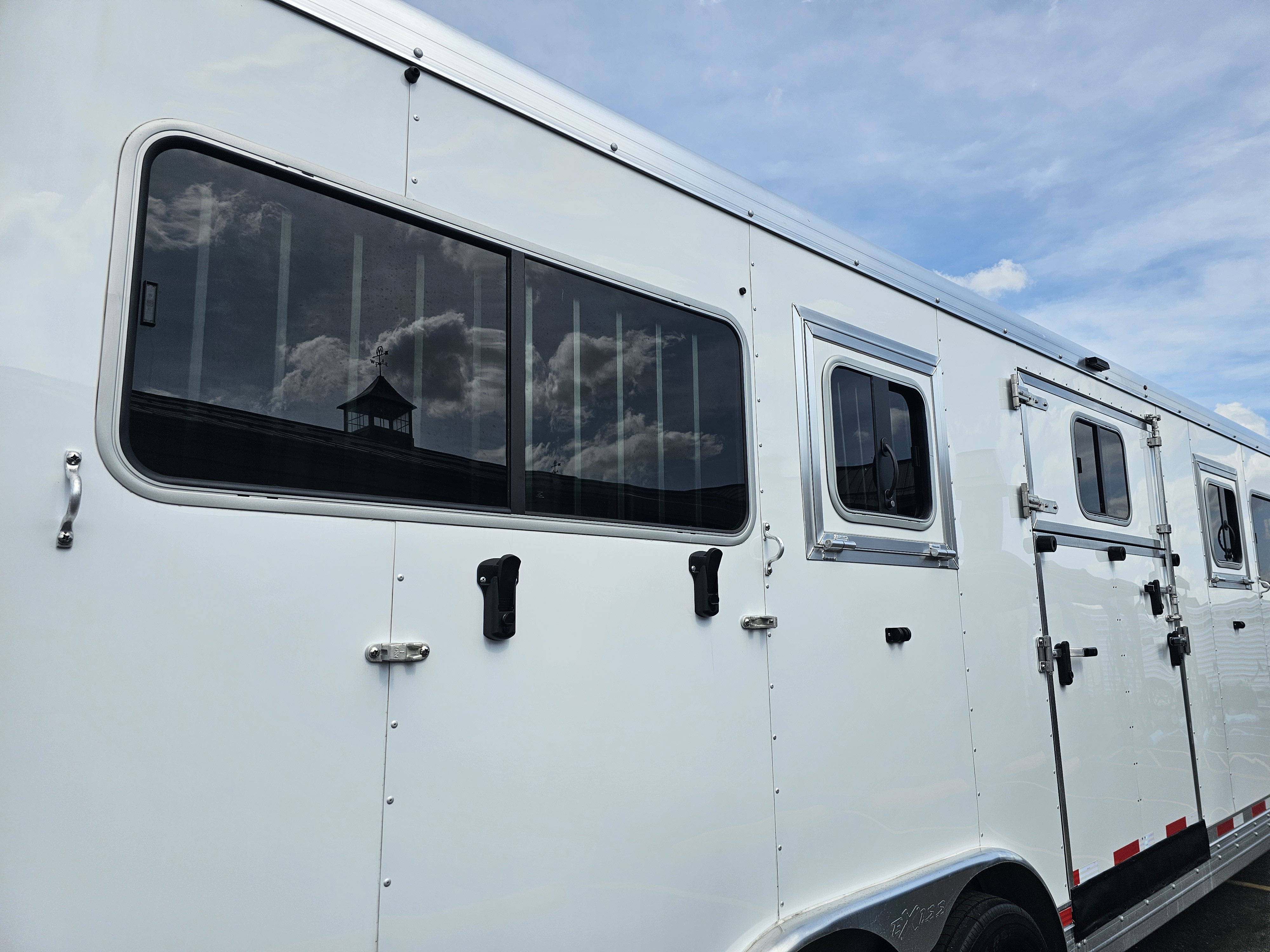 Horse area walls insulated and lined w/ white aluminum; Rubber installed 48″ high w/ white aluminum lining above; Aluminum kickplate behind rubber lining