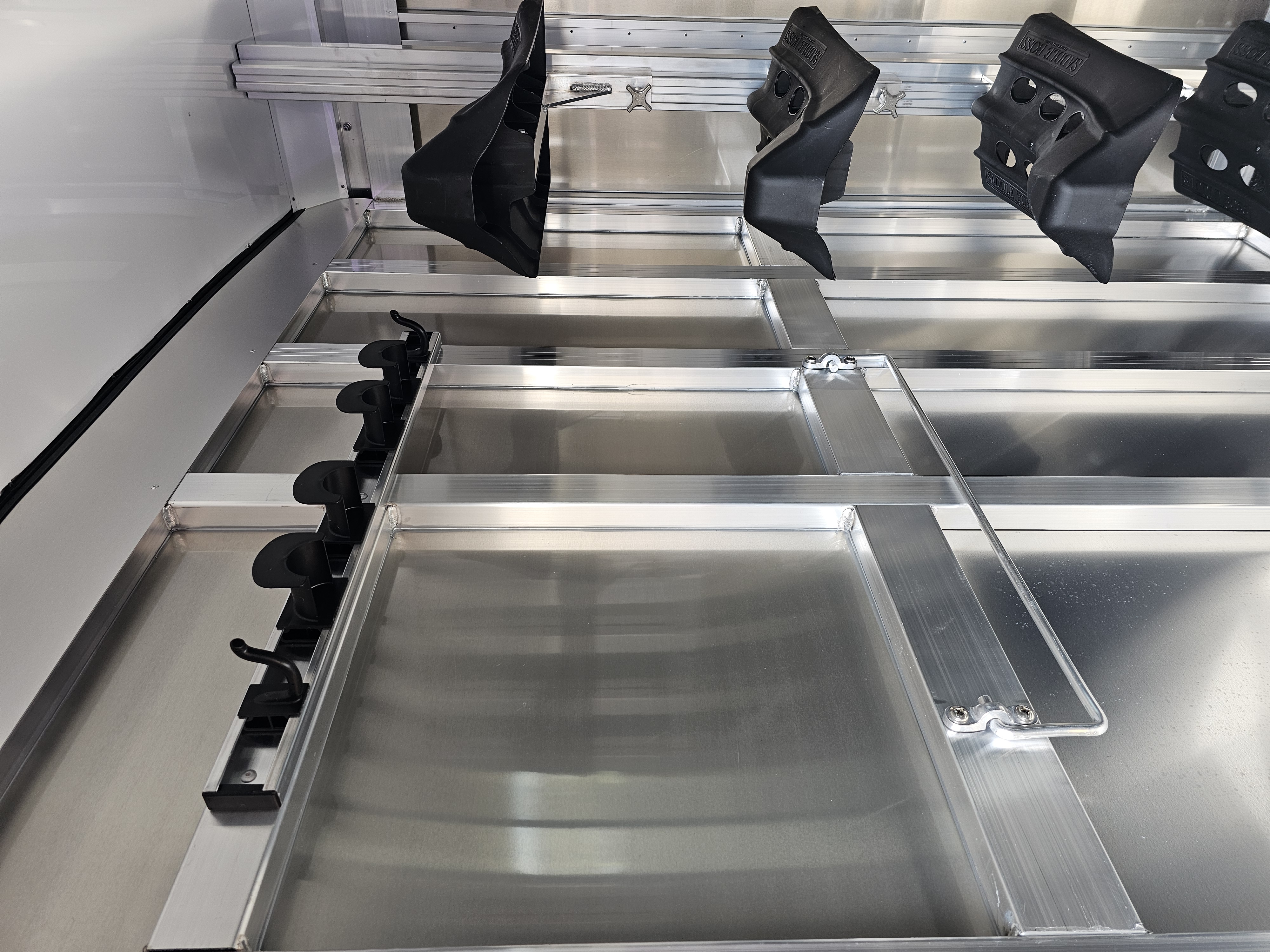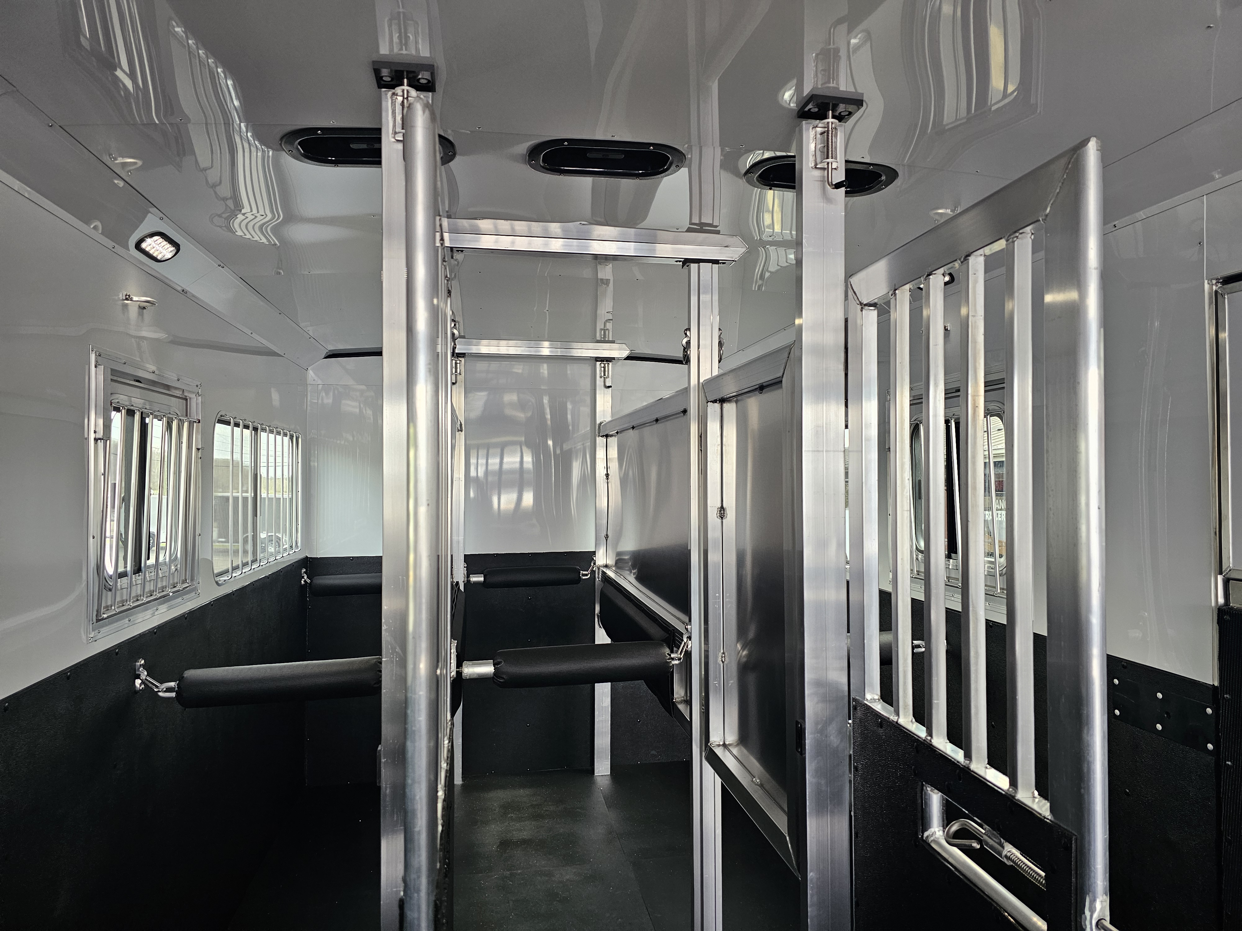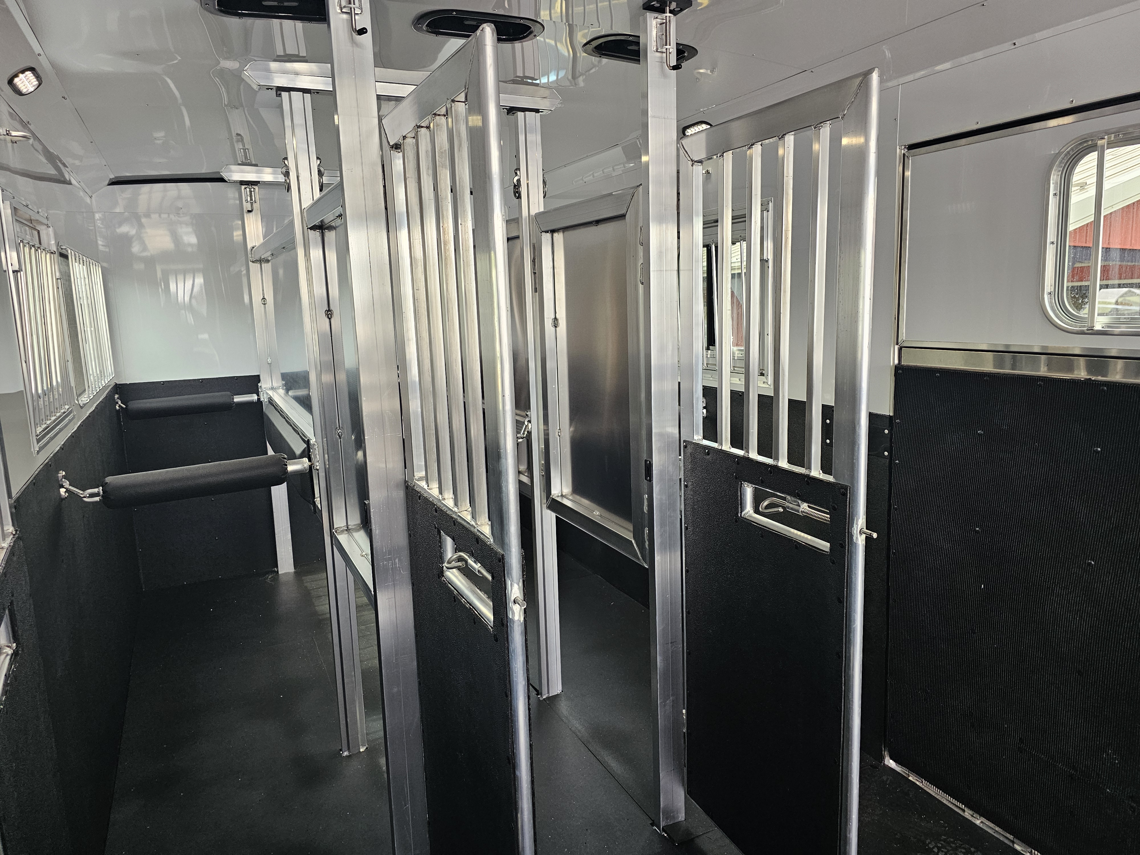 Two padded 7’ dividers w/ body and shoulder separators; Stud gates at front of each stall with head dividers
