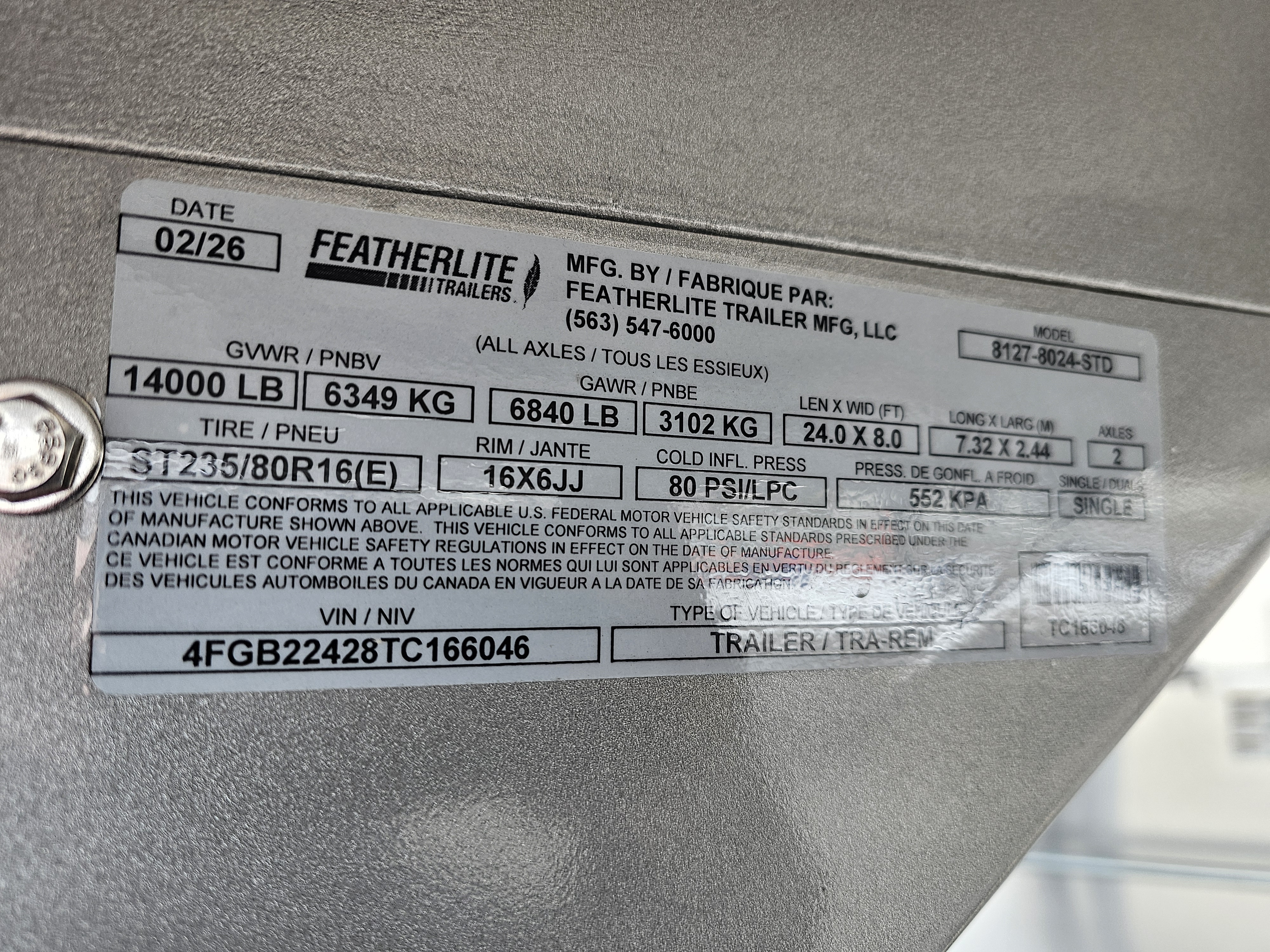 Tandem axle 7.0K rubber torsion. Includes (4) GY tire/rim ST235/80R16 LRE & 8 hole silver MOD wheel & hub cover