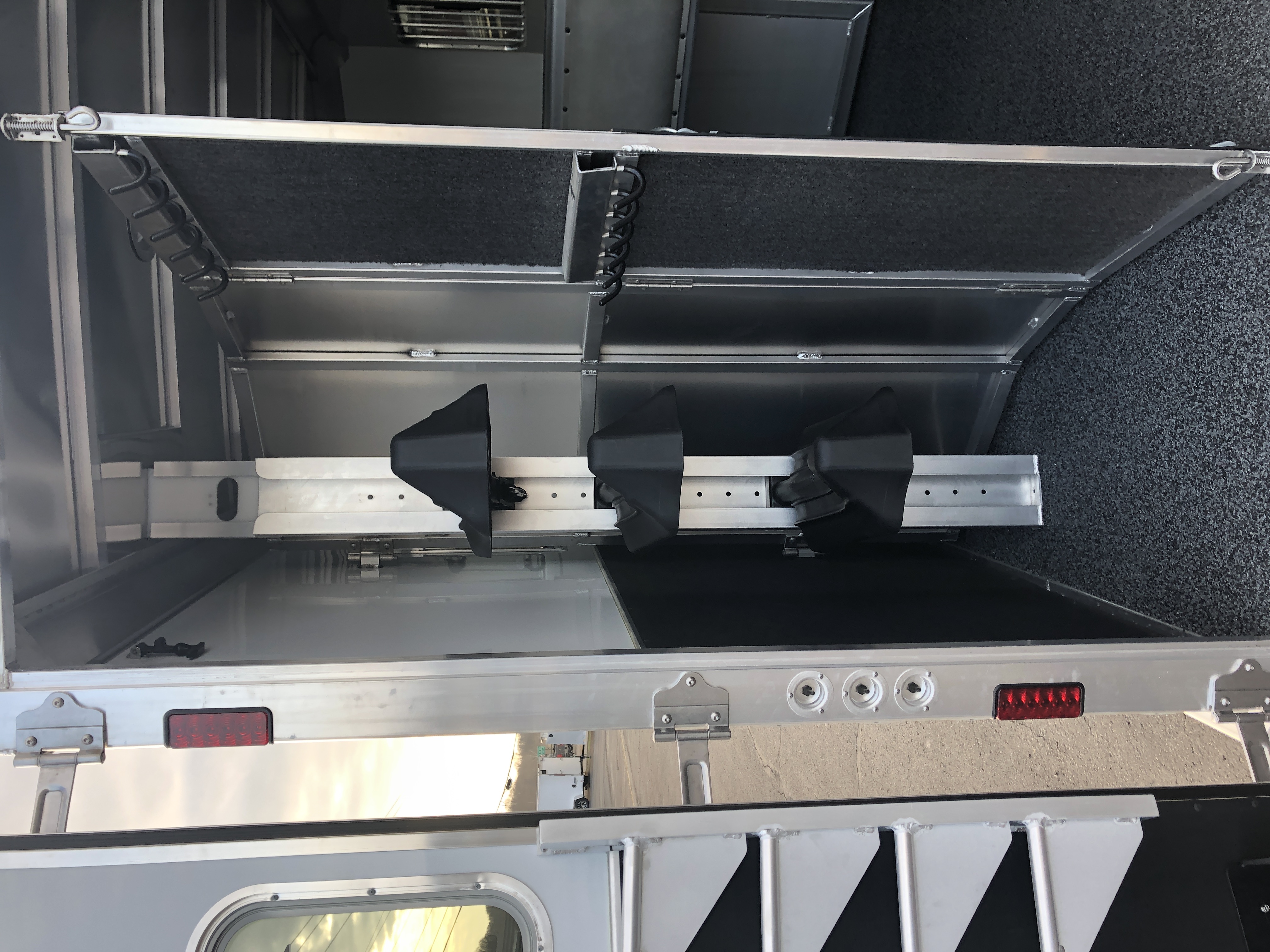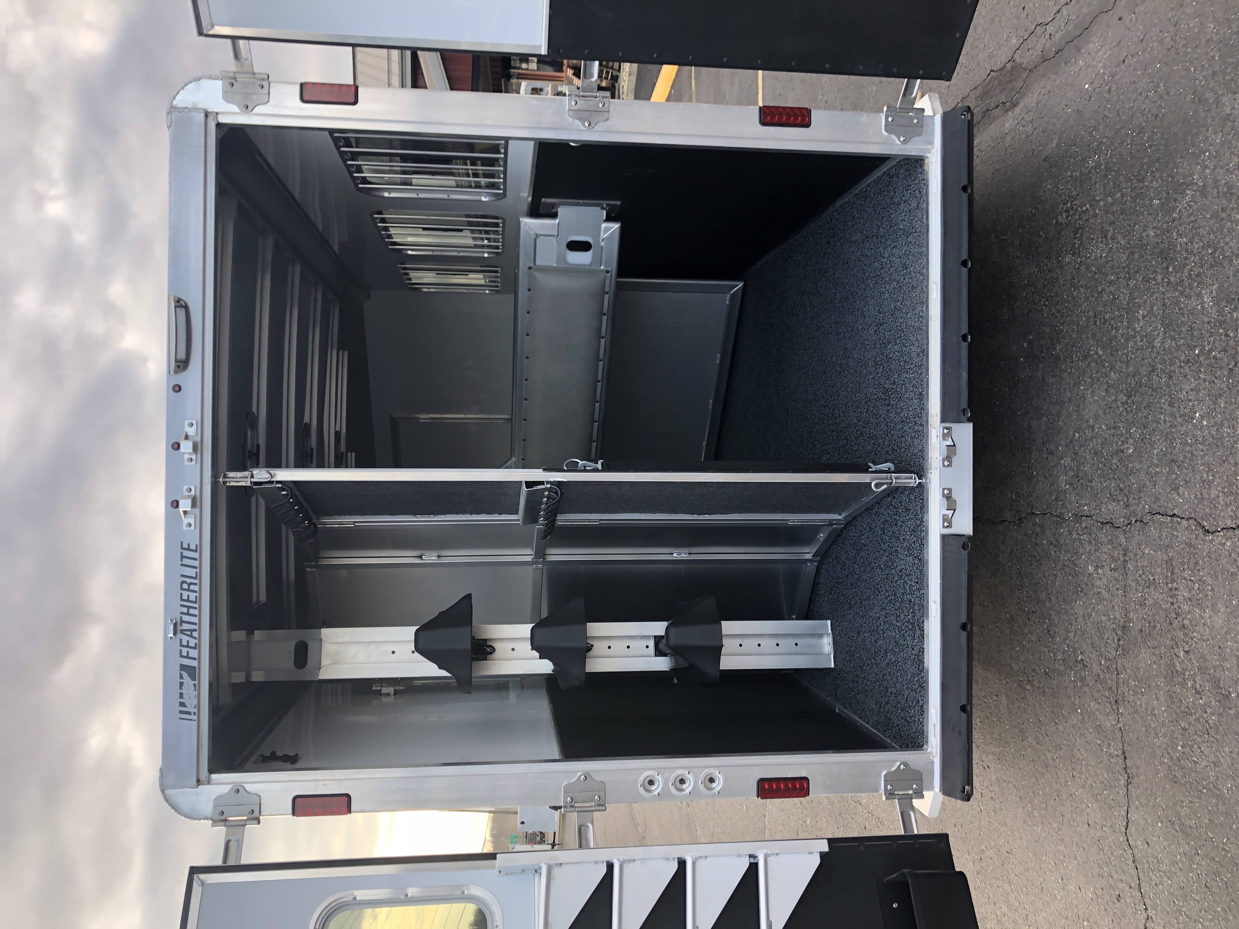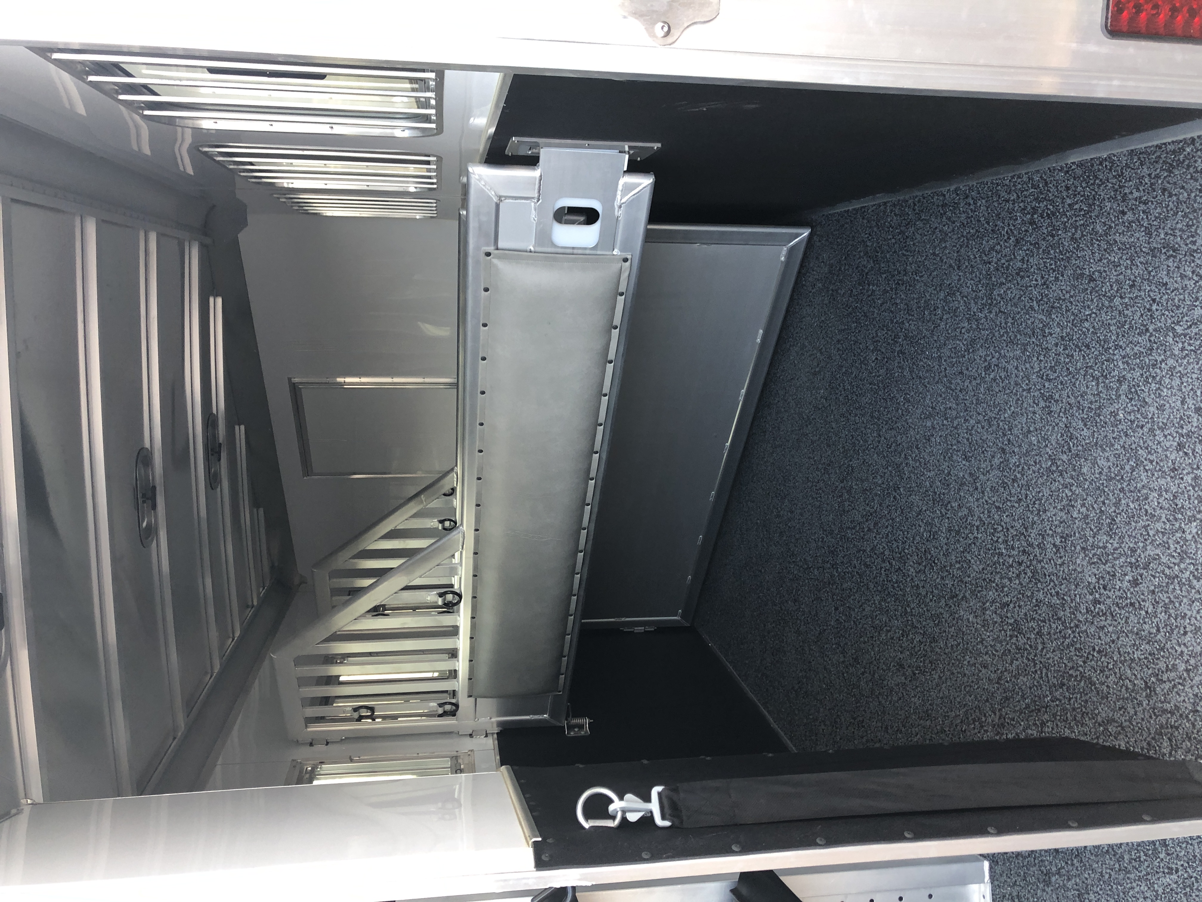 | Escape Doors | Square side unload door in front of first horse with nylon strap |