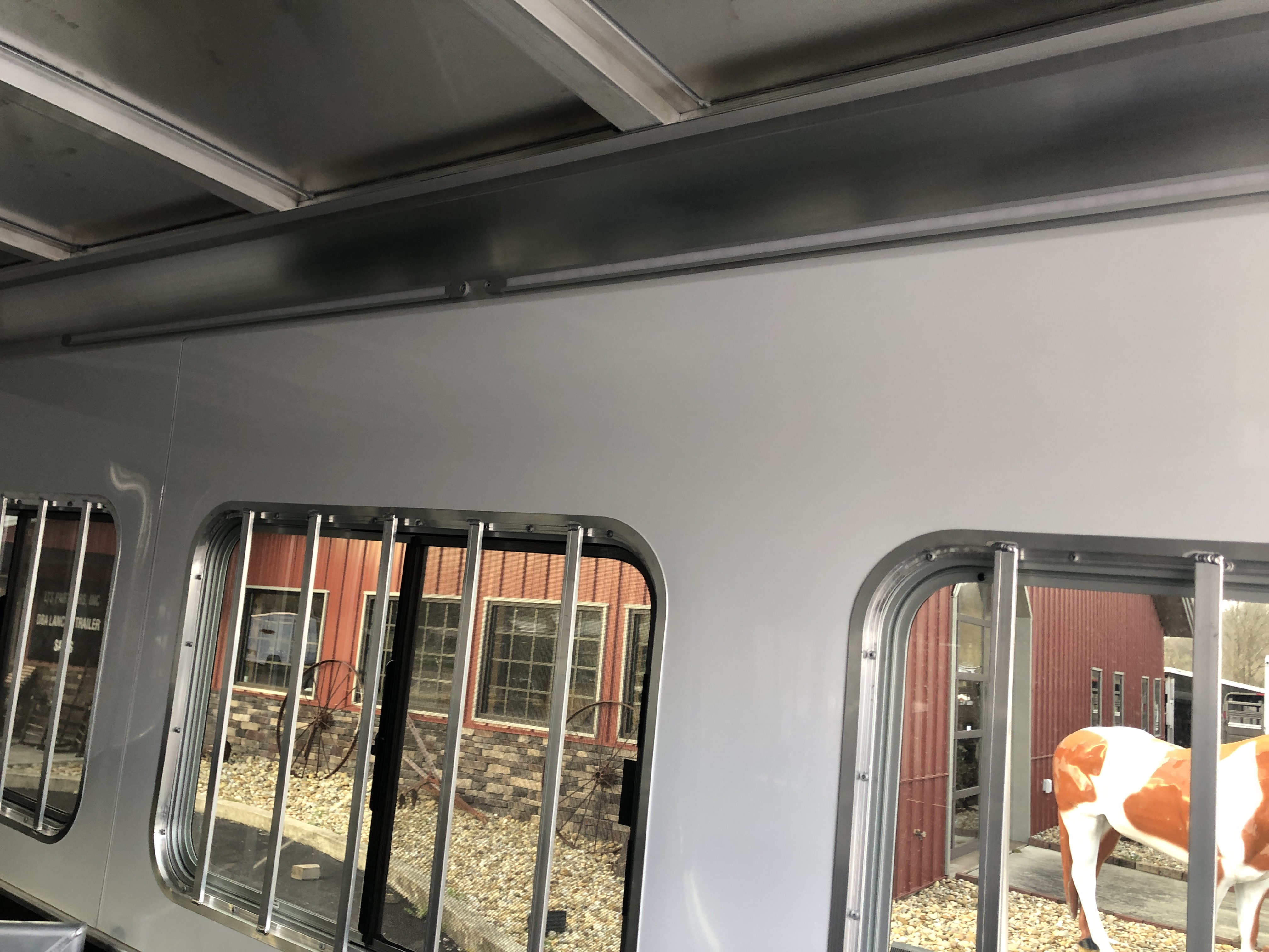 | Walls | Rubber up 44″ on the wall in front of horses; Rubber up 48″ on wall behind horses; .090 aluminum up 48″ on walls behind horses and in front of horses; .040 white aluminum lining above the wall rubber |