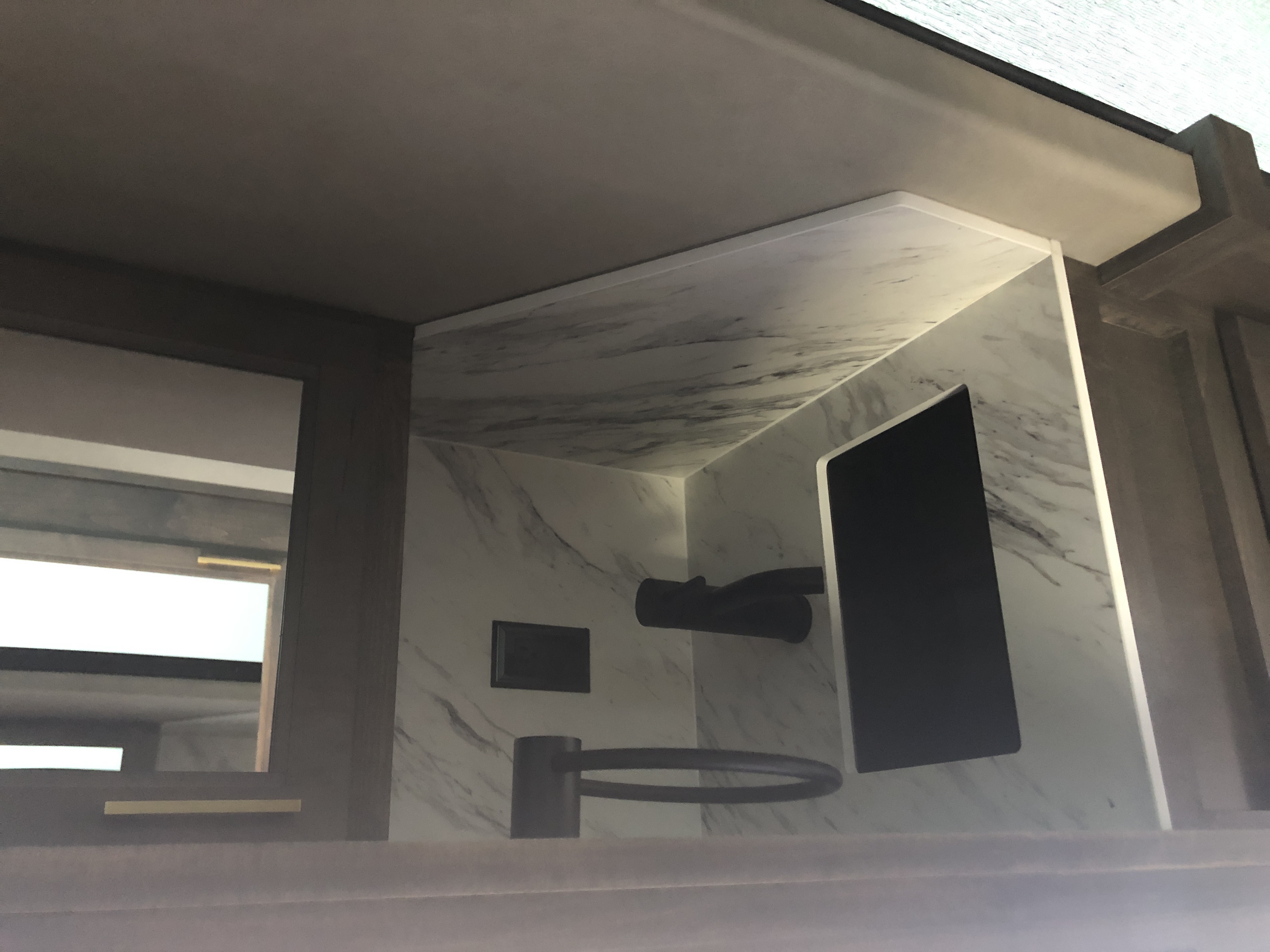 | Restroom | Bathroom sink with medicine cabinet above; Linen closet w/ light and mirrored doors; Porcelain foot flush toilet; Power lift roof vent; Hollow core pocket door; Sky dome above shower |
