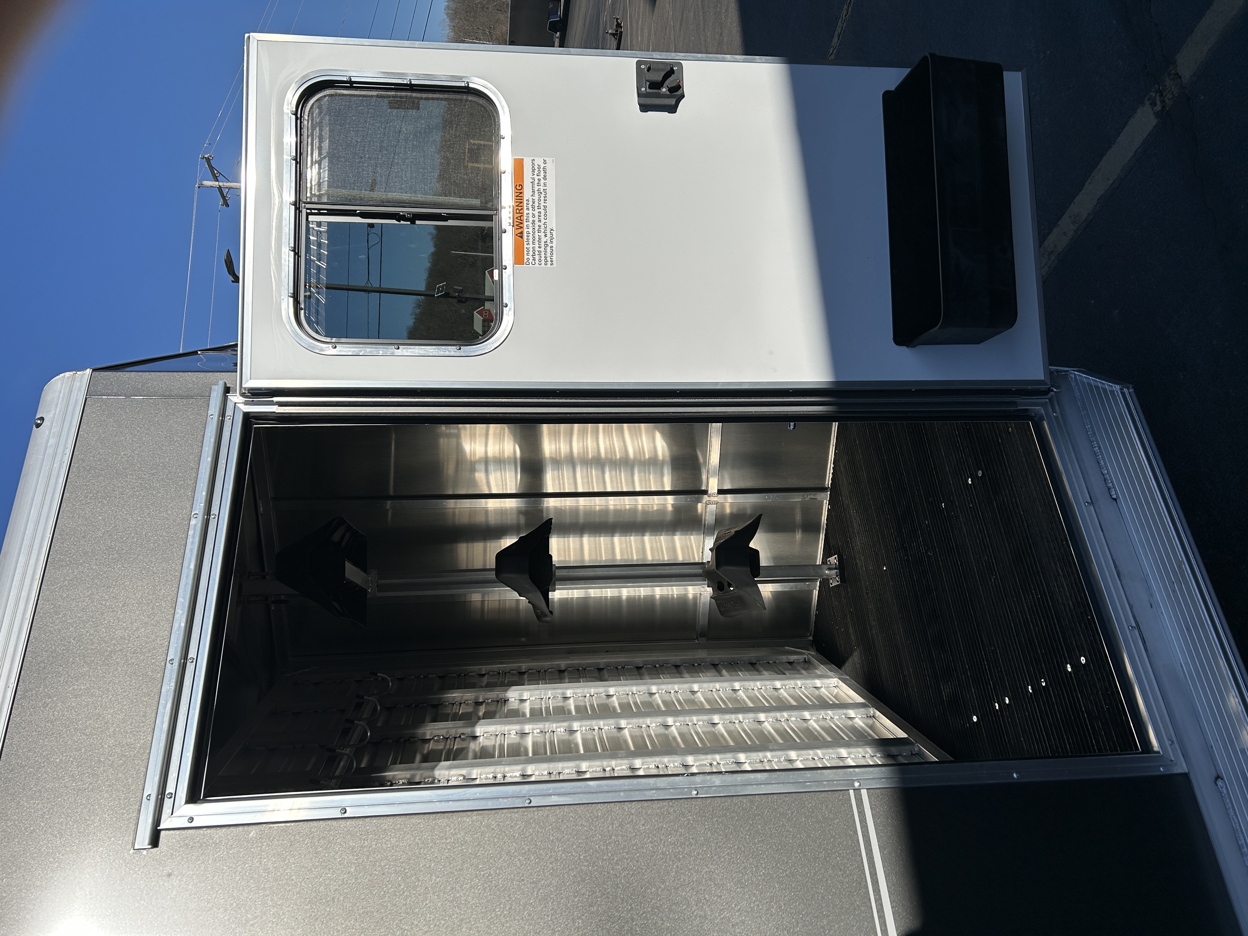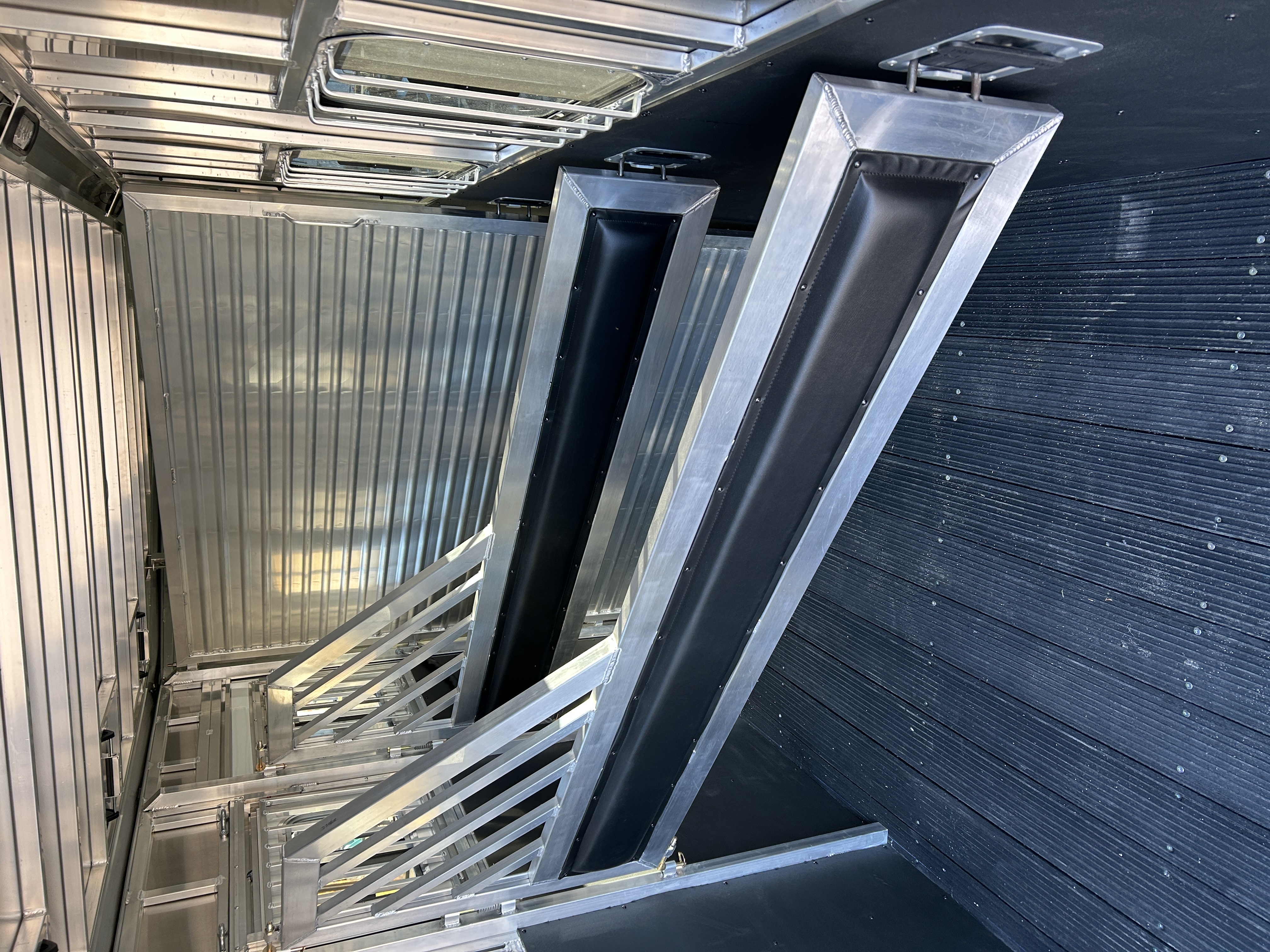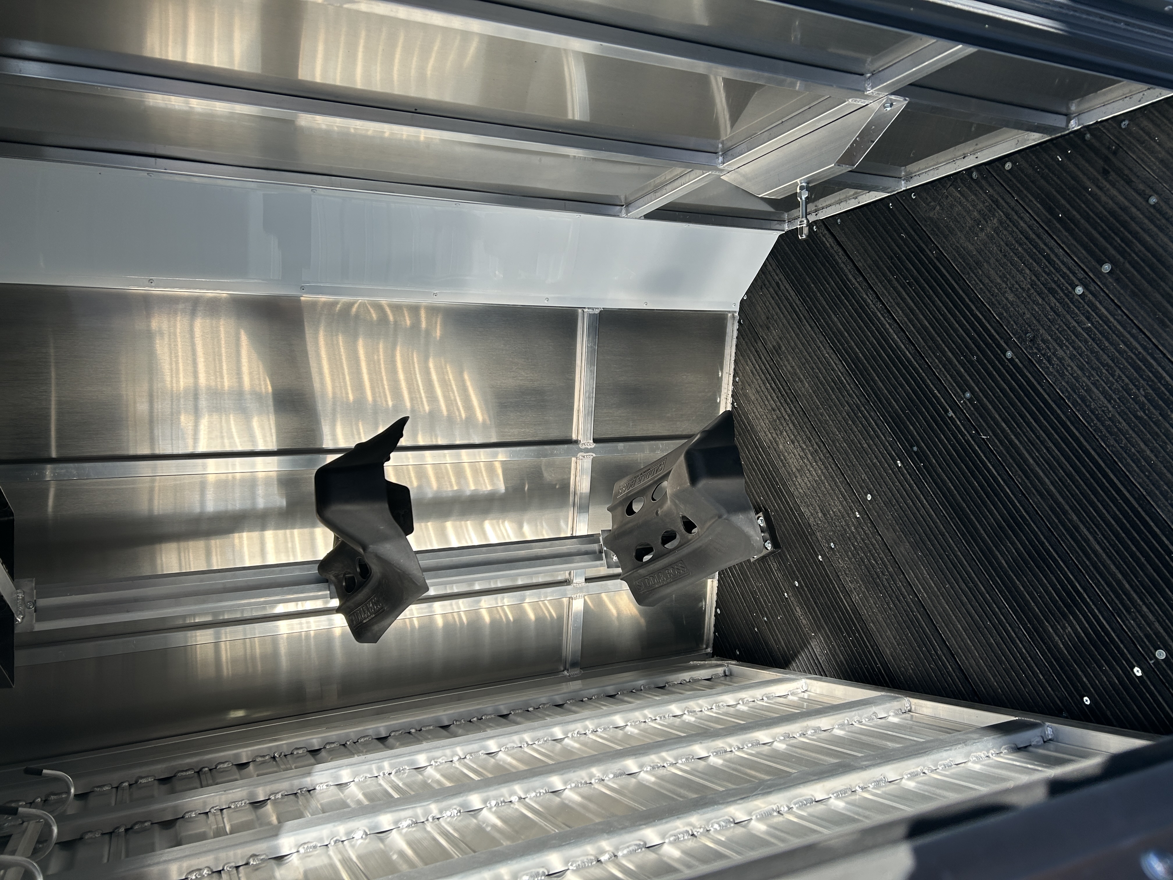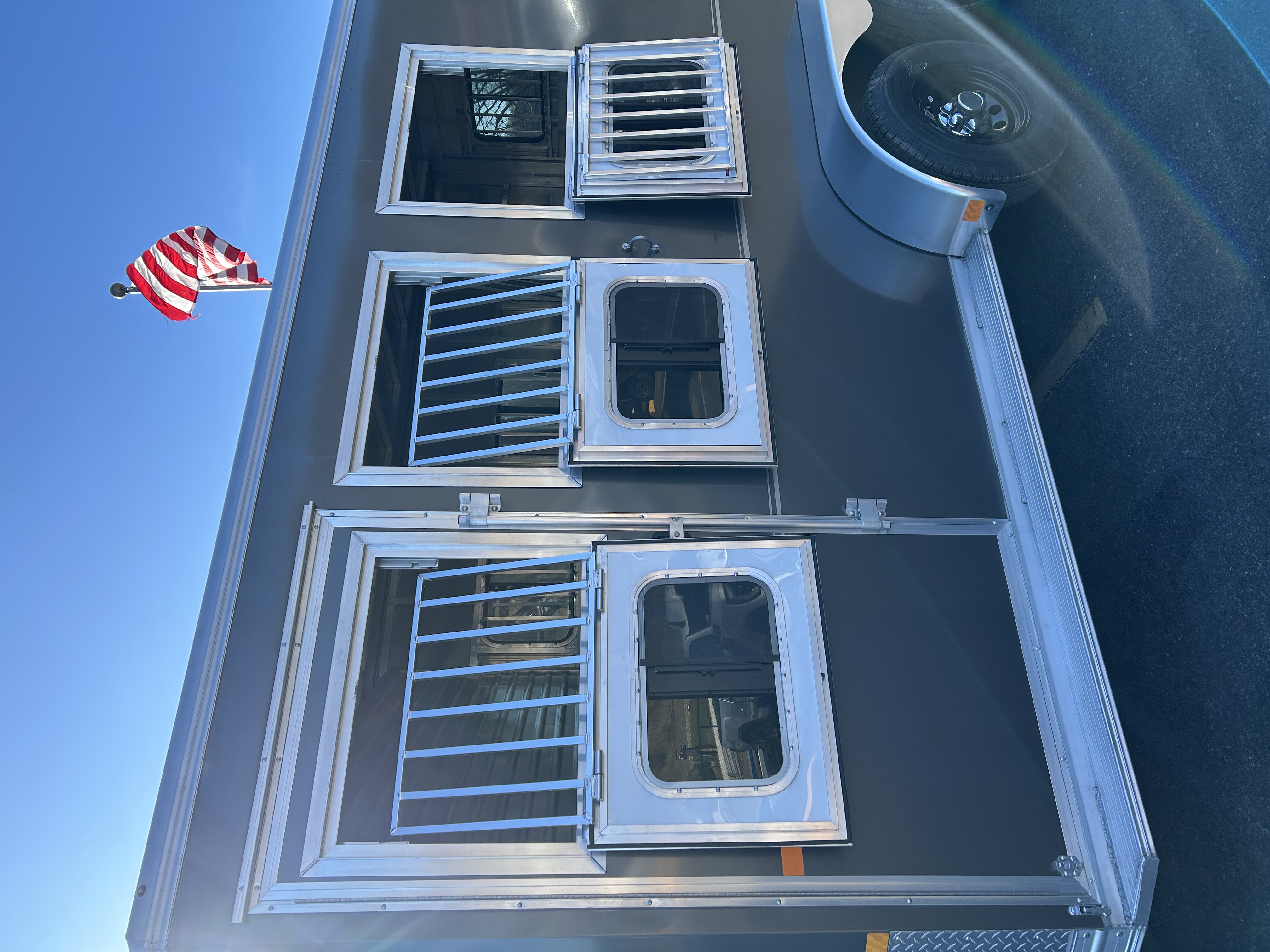 .040 Aluminum Skin Full Length Running Boards Heavy Duty Rear Step up Rubber Bumper Exterior Light: LED ---------- Horse Area: Stall Width: 40-1/2" Dividers: Removable Jail Bar Head and Shoulder Divider - w/ Pads (Custom Extrusion, New Latch System) Feed Windows: 32" x 25" Premium Square Drop Down Feed Windows - w/Integrated Face Bar (1 per stall)