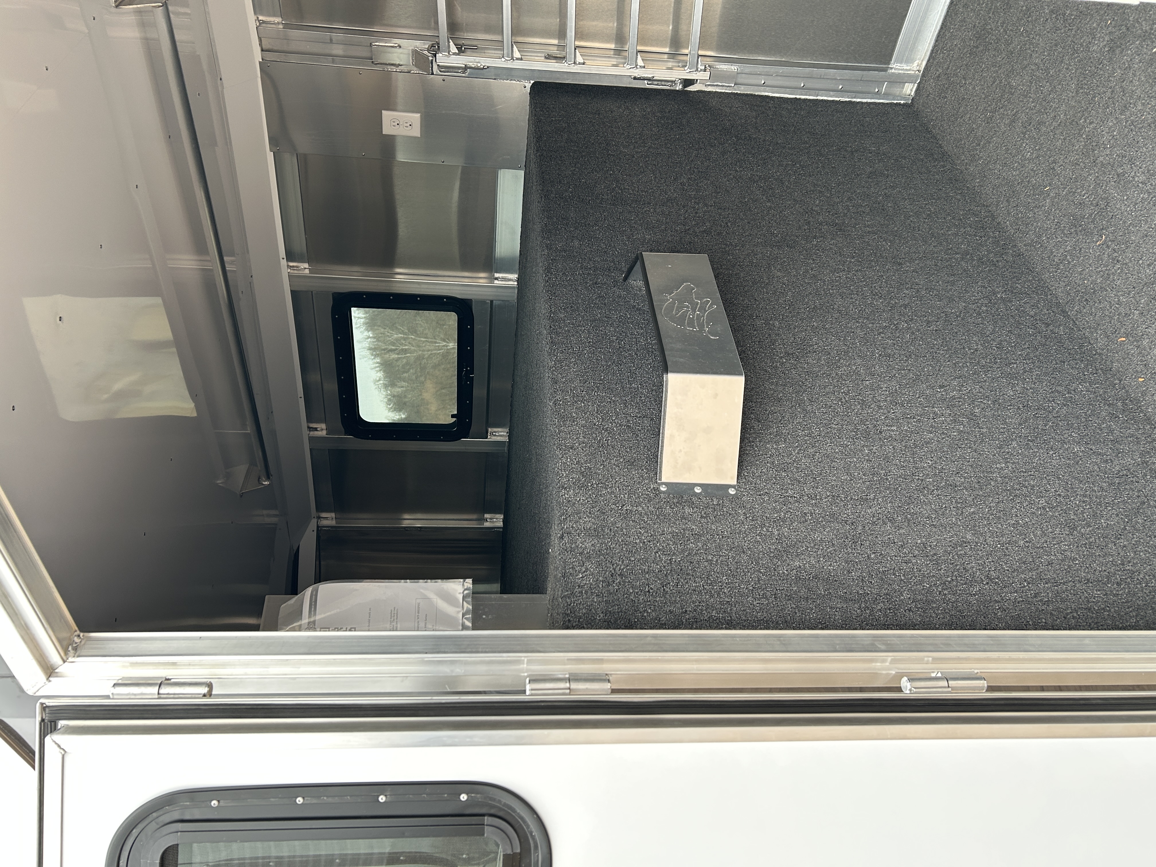 - Horse area walls insulated and lined w/ white aluminum; Rubber installed 48″ high w/ white aluminum lining above; Aluminum kickplate behind rubber lining